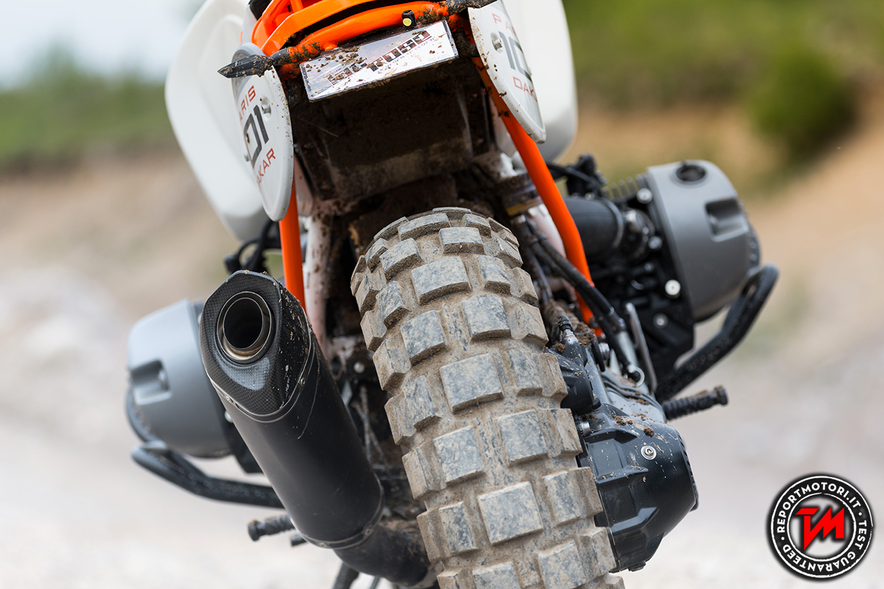 Il piccolo cupolino è prassi nella Paris-Dakar, con il proiettore sempliceed il classico parafango puntato in alto, il serbatoio carburante è stato maggiorato per l’occasione, così come di nuovo sviluppo sono i paramani, un must per una moto destinata a competere.