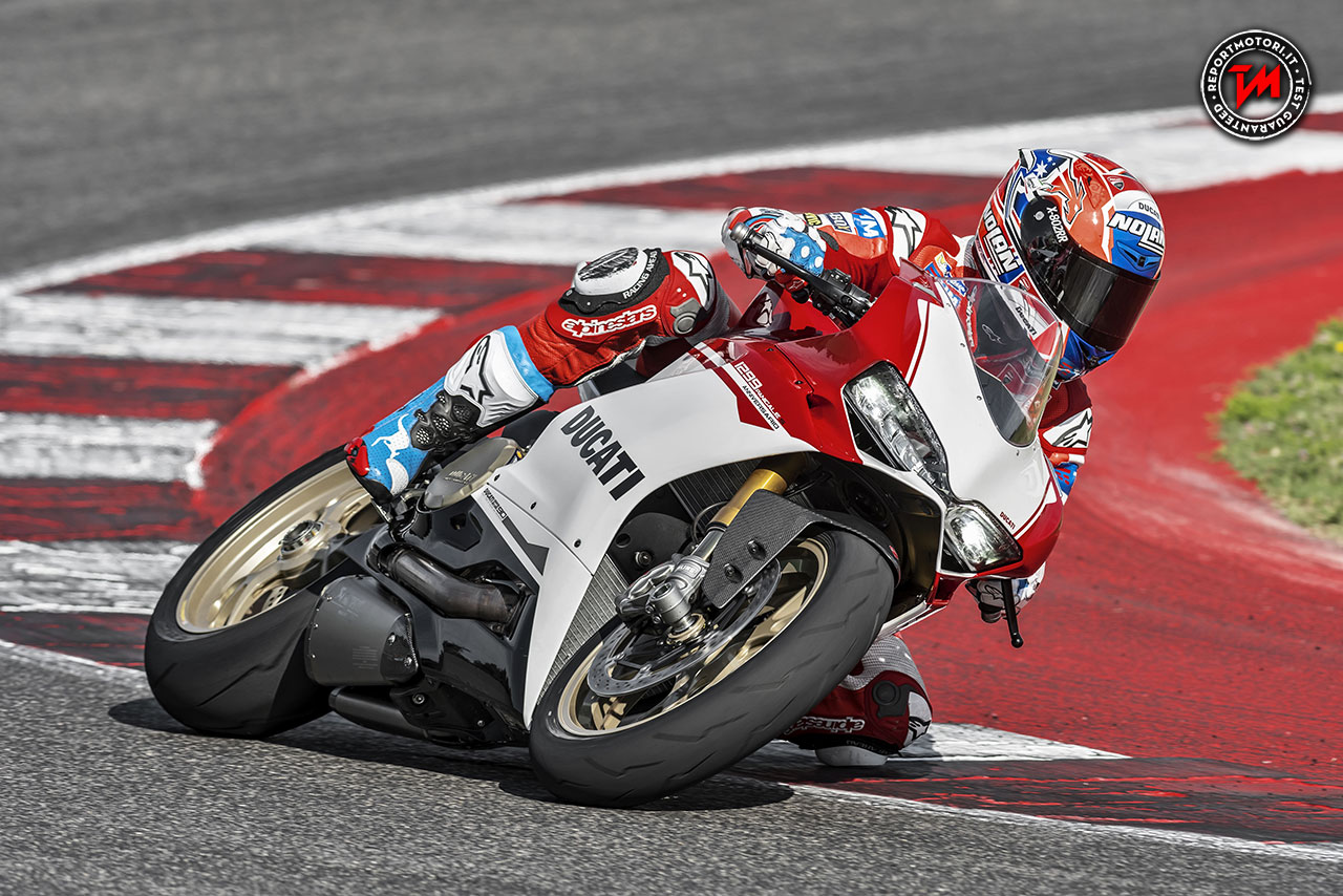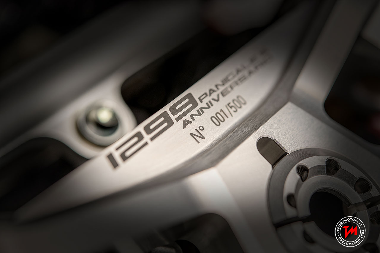 Ogni piastra di sterzo è unica perché numerata, con iscrizione laser, secondo l’ordine di produzione di serie della moto. Le boccole di sterzo, eccentriche, consentono di replicare le quote ciclistiche della stupenda Panigale R spostando in avanti il perno di sterzo di 5 mm rispetto agli altri modelli della famiglia Panigale. Inoltre, una leggera batteria al litio, assieme ai paratacchi, il parafango posteriore e la cover dell’ammortizzatore in fibra di carbonio permettono un risparmio di peso di 2,5 kg.