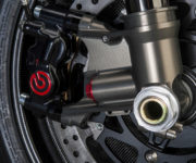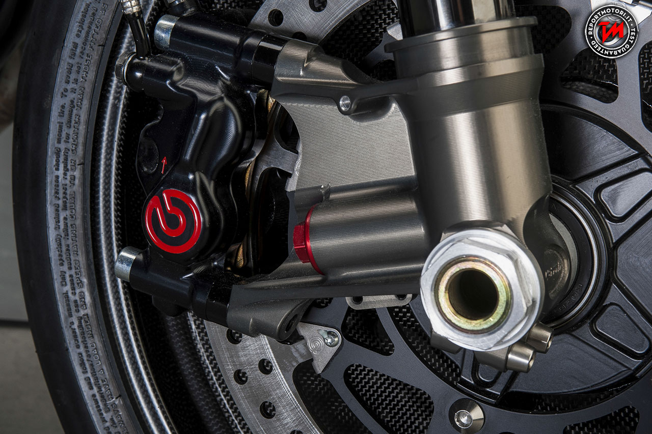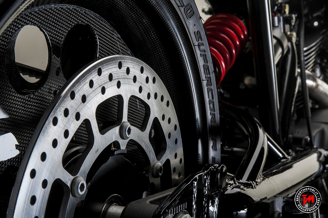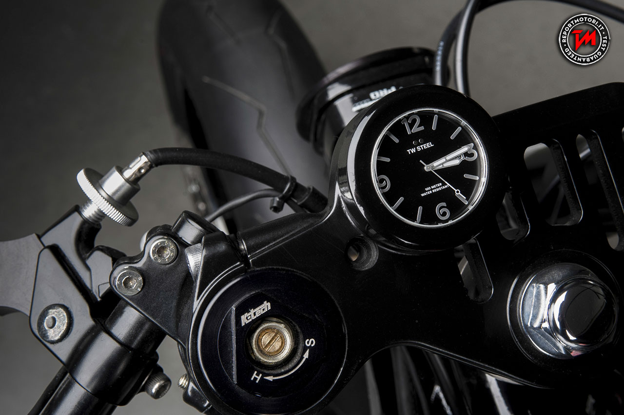 Con l’obiettivo di ottenere più velocità in rettilineo, Roderick ha tagliato ed allungato il telaio, rinunciando a molti componenti standard con l’eccezione del motore originale, ricco di coppia. Una serie di pezzi unici, creati artigianalmente, ne definiscono l’eccezionale carattere Racing. Cover motore, prese d’aria, sella e serbatoio su misura confermano che questa Yard Built è nata per le alte velocità, strizzando così l’occhio al proprio fratello spirituale: l’orologio ‘Son of Time’ di TW Steel. Lo scarico Nozem garantisce la giusta e ringhiosa colonna sonora, mentre i magnifici e leggeri cerchi in carbonio Dymag riducono il peso del mezzo, aumentandone di conseguenza anche la potenza. Chi gareggia sui rettifili necessita di freni all’altezza delle prestazioni: per questo motivo sono state montate pinze monoblocco Brembo, dischi flottanti Brembo da 320 mm e pompa dei freni Brembo RCS 19. Grazie alle leve di freno e frizione regolabili PP e alle manopole Biltwell Kungfu, chi guida ha sempre la situazione sotto controllo. Potenza e stabilità sono inoltre garantite dalle sospensioni. Per questo componente fondamentale, Roderick si è rivolto a K-Tech scegliendo di utilizzare il kit forcella e ammortizzatori, entrambi regolabili. Gli pneumatici Pirelli Diablo Supercorsa assicurano un ottimo livello di trazione. Completano la lista di componenti di altissima levatura, entrambi by Dynojet, la centralina elettronica Power Commander che permette la regolazione dell’iniezione per ottenere il massimo del rendimento del motore indipendentemente dall’apertura del gas, e il cambio elettronico Quickshifter. Il contagiri by Motogadget Pro ed il faro anteriore a LED disegnato da Baja identificano infine la linea da vera sportiva di questo incredibile mezzo.
