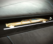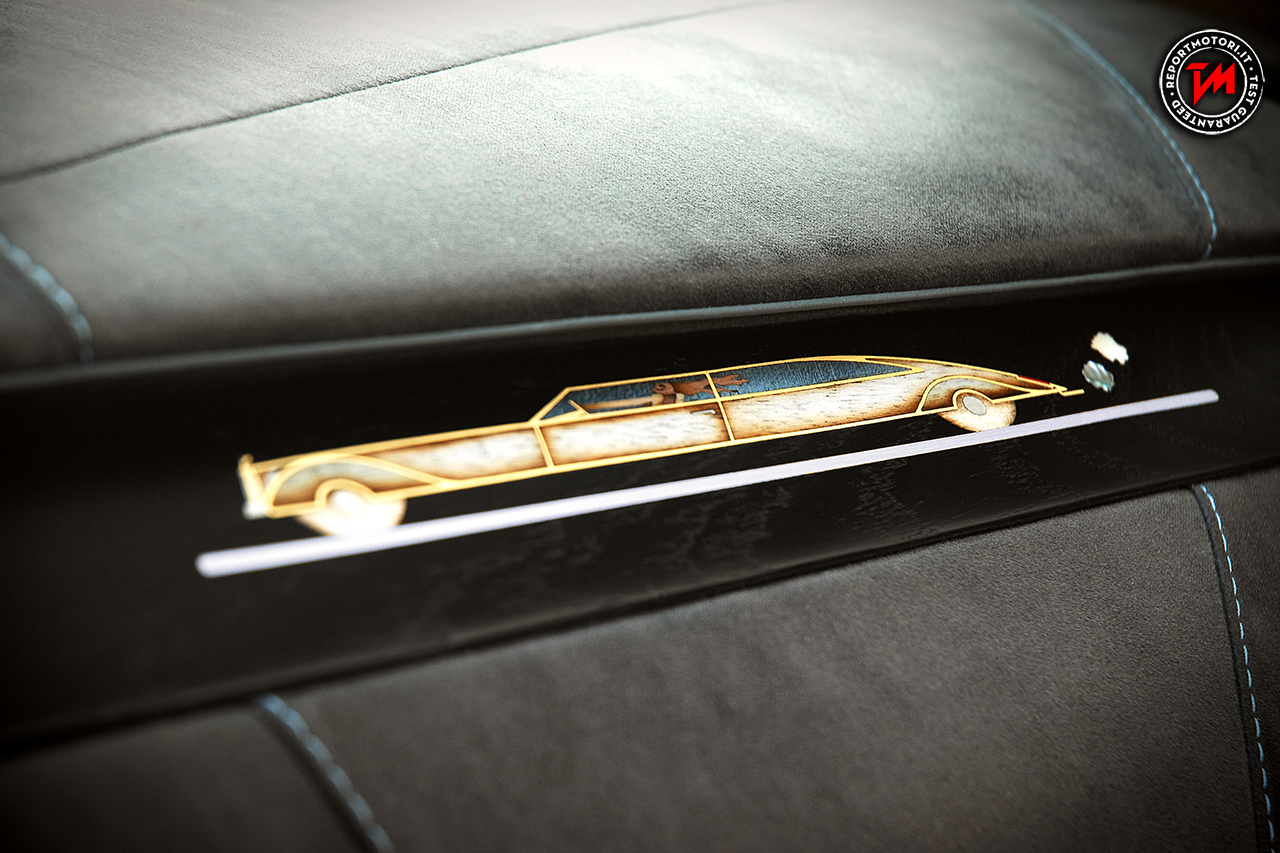 La vera firma, il “titolo” di questa vettura, è sul lato passeggero. Un prezioso intarsio in legni colorati, metallo e madreperla riporta fedelmente il disegno contenuto nel biglietto di auguri e speriamo possa distrarre anche il più timoroso dei padri da una eccellente guida di cui non è mai riuscito a fidarsi pienamente.”