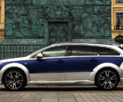 Bleu Agatha per l’omonimo conducente, Blanc de Paris per l’ospite a fianco, sono le parti di colore separate con modanature in legno fossile e profili antiurto dalla speciale vernice alluminio della Peugeot 508 RXH Castagna Gris, nostra interpretazione dell’originale Coupe Franche di Peugeot.