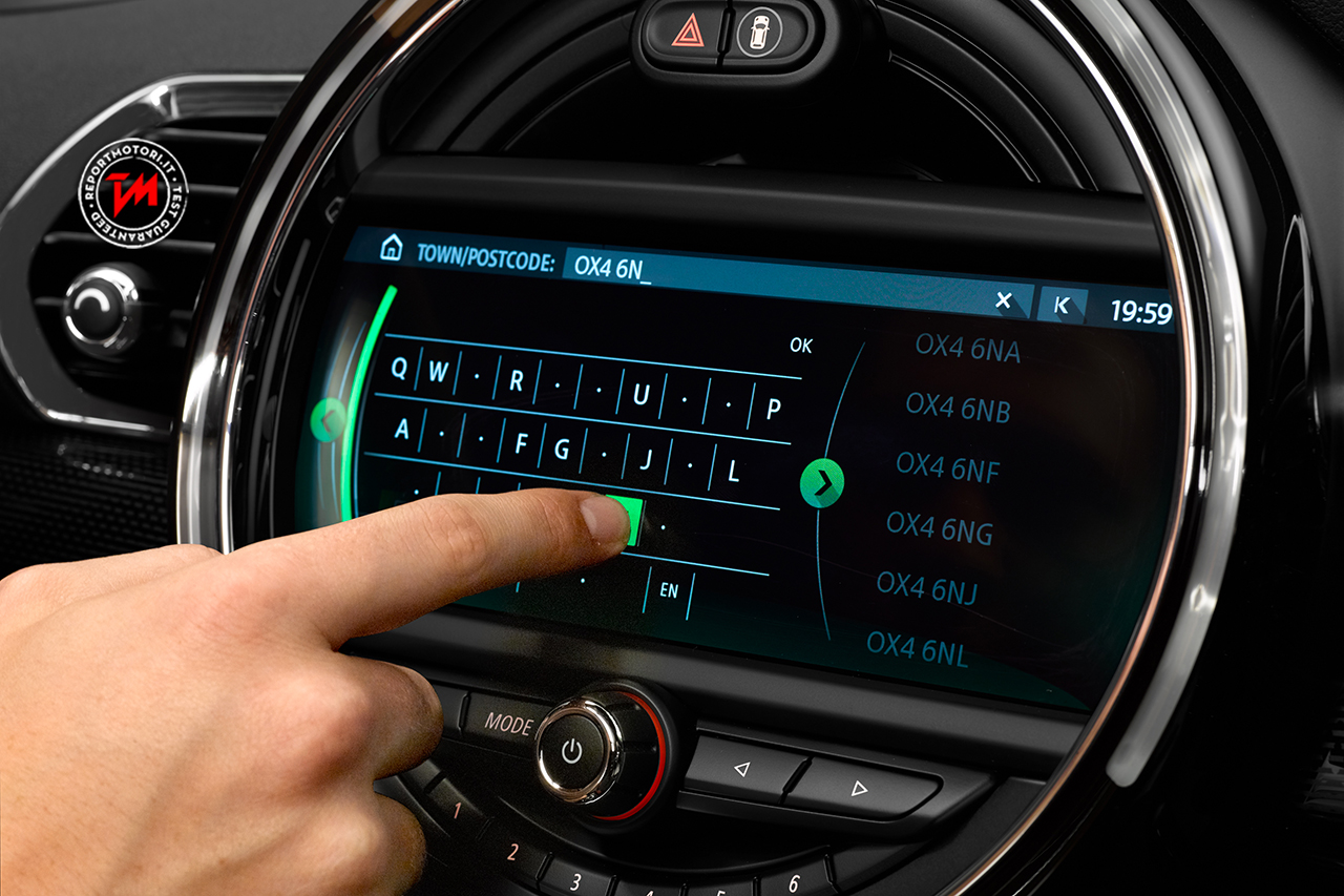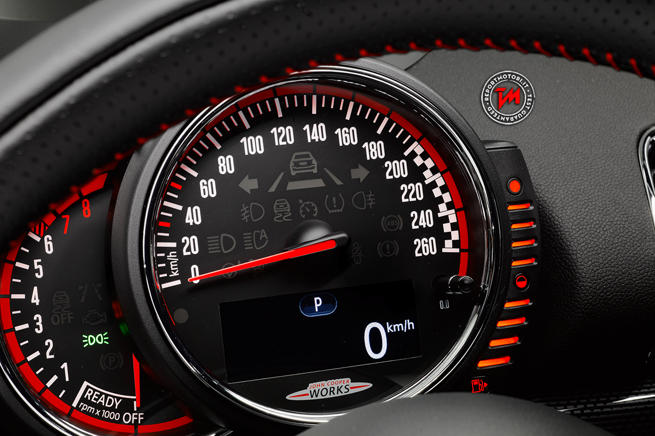 Sofisticato concetto di visualizzazione e di comando; strumento combinato sul piantone dello sterzo; tipico strumento centrale del brand con schermo a colori da 6,5 pollici nella versione di serie e da 8,8 pollici come optional; comandi Toggle incluso il pulsante start/stop per l’avviamento e lo spegnimento keyless del motore; consolle centrale con bracciolo; MINI Controller, tasto freno di stazionamento elettrico, vaschette porta-oggetti e due porta-bicchieri; come optional, MINI Head-Up-Display con contenuti specifici John Cooper Works.