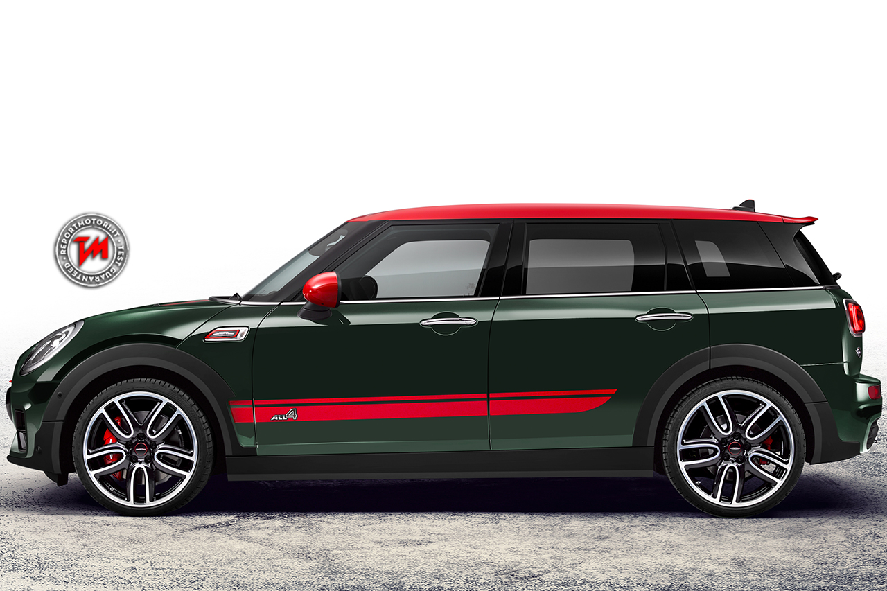 Interpretazione audace e sportiva dell’innovativo concetto di shooting brake, unico nel segmento delle vetture compatte; silhouette dallo slancio dinamico con lunga linea del tetto; quattro porte laterali; due volumi con le caratteristiche Split Doors; per ottimizzare le proprietà aerodinamiche, Air Curtain, Air Breather e altri stilemi di design tipici di John Cooper Works; nel modulo frontale della vettura le prese d’aria laterali particolarmente grandi sostituiscono le luci di posizione e i fari fendinebbia; brancardi disegnati appositamente per il modello; larga grembiulatura posteriore nella quale sono integrati i terminali obliqui dell’impianto di scarico sportivo bistadio; spoiler posteriore John Cooper Works; calandra del radiatore esagonale con struttura a nido d’ape e listello orizzontale in chili red: logo John Cooper Works sulla calandra del radiatore, sulle Side Scuttle e in coda; vernice della carrozzeria in rebel green, vernice di contrasto rossa per il tetto e le calotte degli specchietti retrovisori esterni e sport stripes rosse o nere come optional esclusivi riservati ai modelli John Cooper Works.