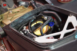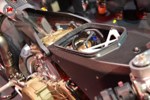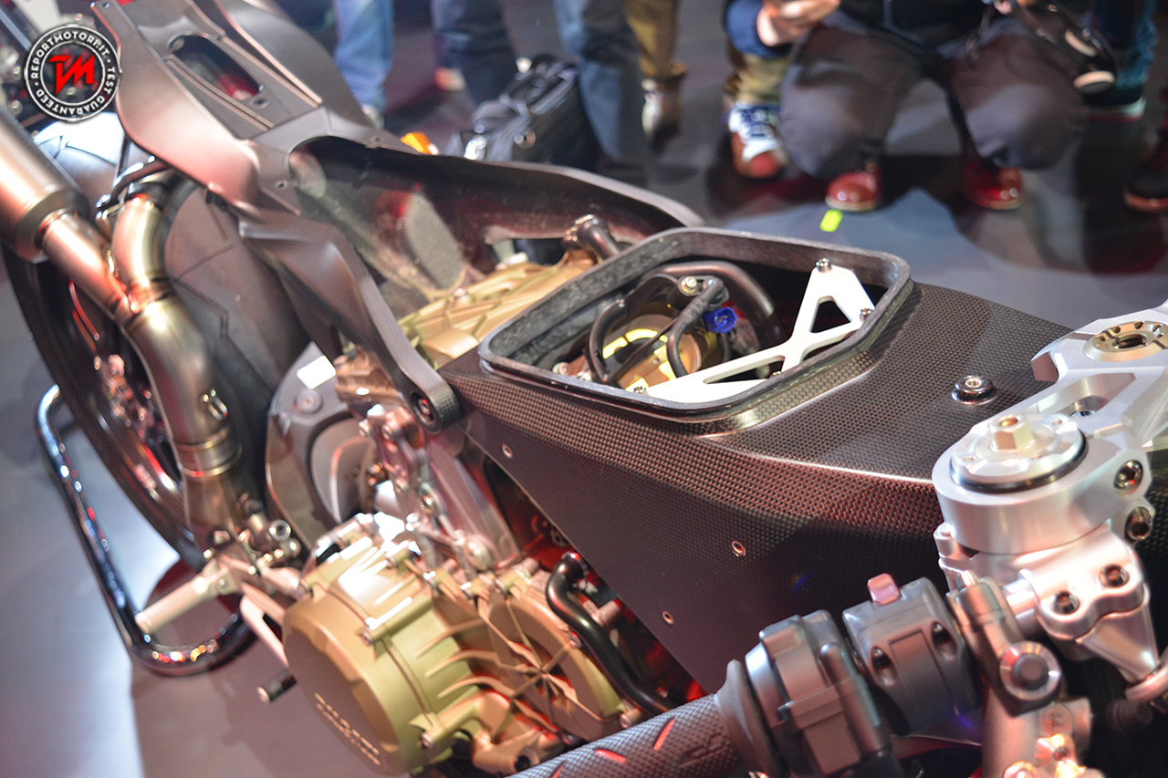 Dal telaio ai fantastici cerchi, ai foderi forcella, tutto è in fibra di carbonio, come si suole su di una vera moto da corsa.