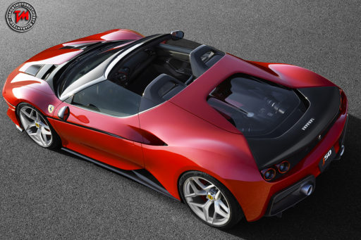 Mentre l’effetto visiera, generato dalle superfici vetrate, ricorda le barchette Ferrari da competizione del passato, la linea di demarcazione nera è una nuova interpretazione di un ricorrente segno stilistico Ferrari utilizzato su vetture iconiche come la GTO, F40 e F50. Tale fuga grafica diventa un elemento chiave che altera la percezione della linea di cintura, fissandola di fatto a un’altezza decisamente inferiore rispetto al solito.