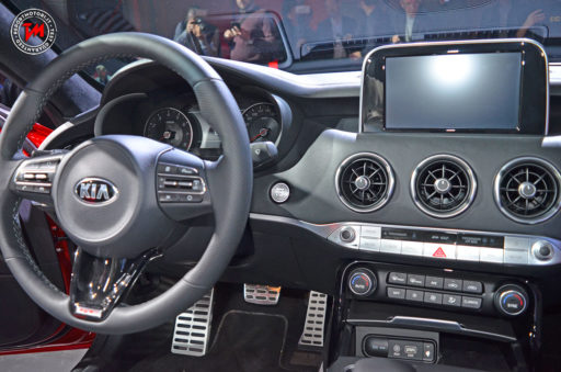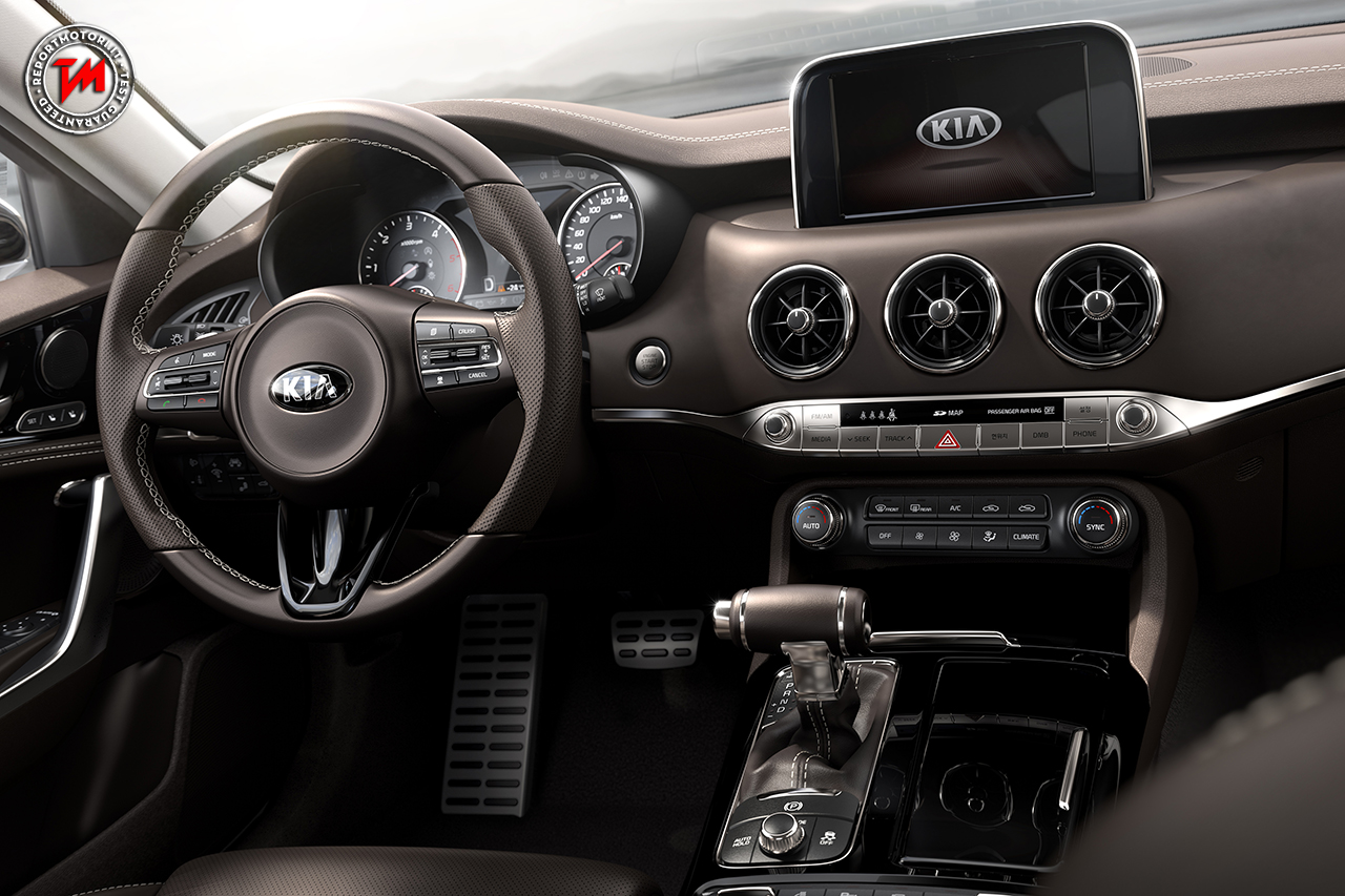 La console centrale è divisa in due aree, i comandi del sistema di intrattenimento centrale presenta uno schermo touchscreen a colori: sul display TFT vengono visualizzate diversi dati, dalle pure indicazioni di performance come le forze G laterali ed i tempi sul giro, alla temperatura olio motore, al navigatore, al sistema di diagnosi interna della vettura, sulla nuova Kia Stinger il pilota ha tutte le informazioni vitali della vettura a portata di mano.