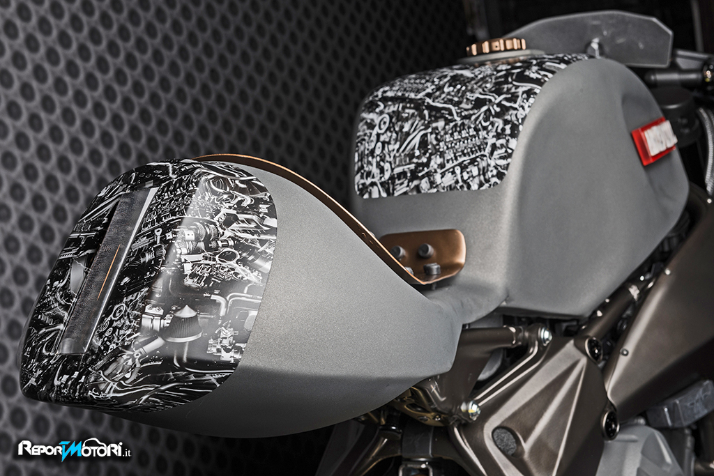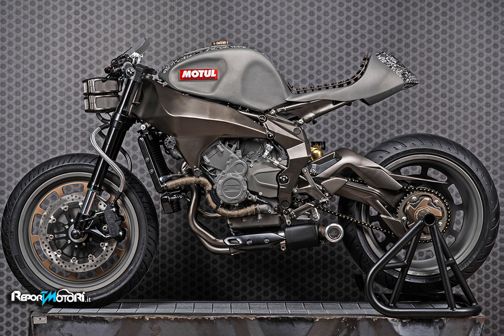 Attualmente si tratta di un’opera d’arte non marciante su base MV Agusta Brutale 800, e in base alla volontà del nuovo proprietario, potrà tornare a viaggiare su strada per regalare nuove emozioni.
