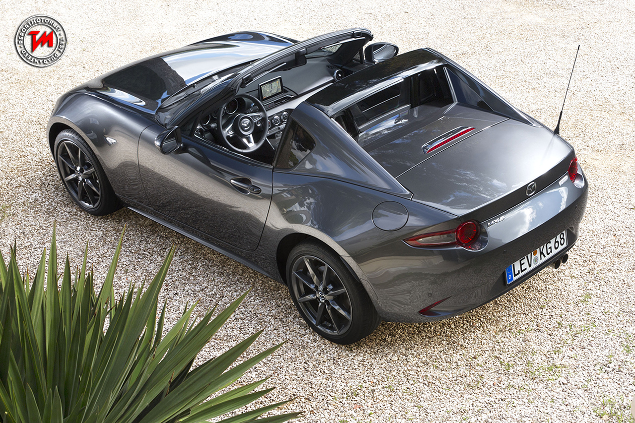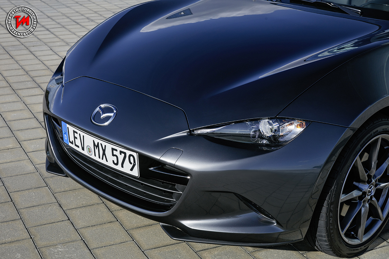 Piuttosto audace, ma il risultato è sicuramente una gioia per gli occhi. L’abitacolo straordinariamente sportivo e le linee del tetto spiccatamente fastback fluiscono armoniosamente verso la coda. Anche il design è elegante, per esempio grazie al minimo gioco tra il tetto e i montanti posteriori che circondano le sezioni della scocca. Anzi, non conoscendola, la MX-5 RF potrebbe essere scambiata per un modello coupé.