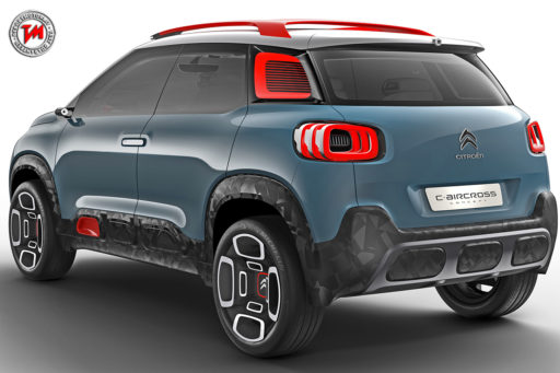 Con C-Aircross Concept, i team del centro Stile Citroën sono riusciti ad abbinare la fluidità delle linee alle caratteristiche di un SUV, su un modello dalle dimensioni compatte (lunghezza: 4,15m, larghezza: 1,74m, altezza: 1,63m). La silhouette è rialzata visivamente dalle protezioni che avvolgono la parte bassa della scocca. Nato per l’avventura, il Concept C-Aircross dispone di paratie di protezione anteriori e posteriori nero lucido, protezioni dei passaruota con un camouflage rivisitato, protezioni laterali nella parte inferiore e originali cerchi da 18 pollici dalle linee scolpite, che suggeriscono un posto di guida rialzato e un carattere da fuoristrada.