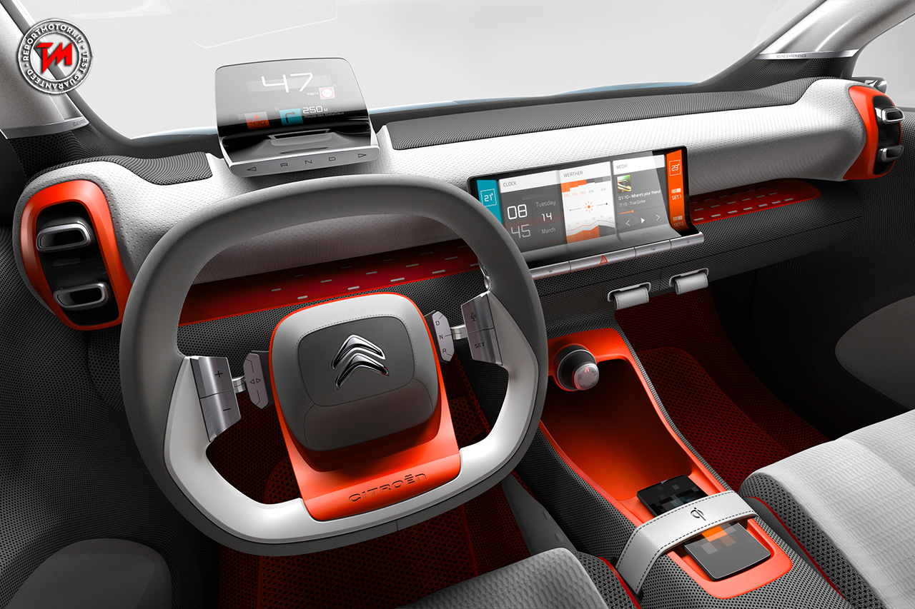 Lavorata nei toni del grigio chiaro e dell’arancione brillante, la plancia è una fascia flottante ed essenziale che gioca con i contrasti fino alle porte e lascia intravedere molti vani d’alloggiamento. Un grande portaoggetti arancione attraversa la plancia in larghezza, messo in evidenza dal colore aranciato delle finiture. La Concept Car C-Aircross propone elementi colorati a livello degli aeratori e dei dispositivi d’aggancio delle cinture di sicurezza. Il Corail Fluo sul pianale e nei tappetini crea un piacevole effetto ton sur ton.