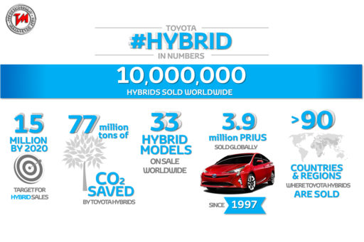 E’ per tale motivo che il gruppo Toyota continuerà a produrre le proprie auto a basso impatto ambientale introducendo sempre nuovi modelli. Dal lancio nel 1997 della Prius e del bus Coaster Hybrid EV , i veicoli ibridi sono stati in grado di soddisfare le esigenze dei clienti di tutto il mondo. Il traguardo di 10 milioni è stato raggiunto a soli nove mesi di distanza dal traguardo precedente di 9 milioni, superato alla fine di aprile 2016.