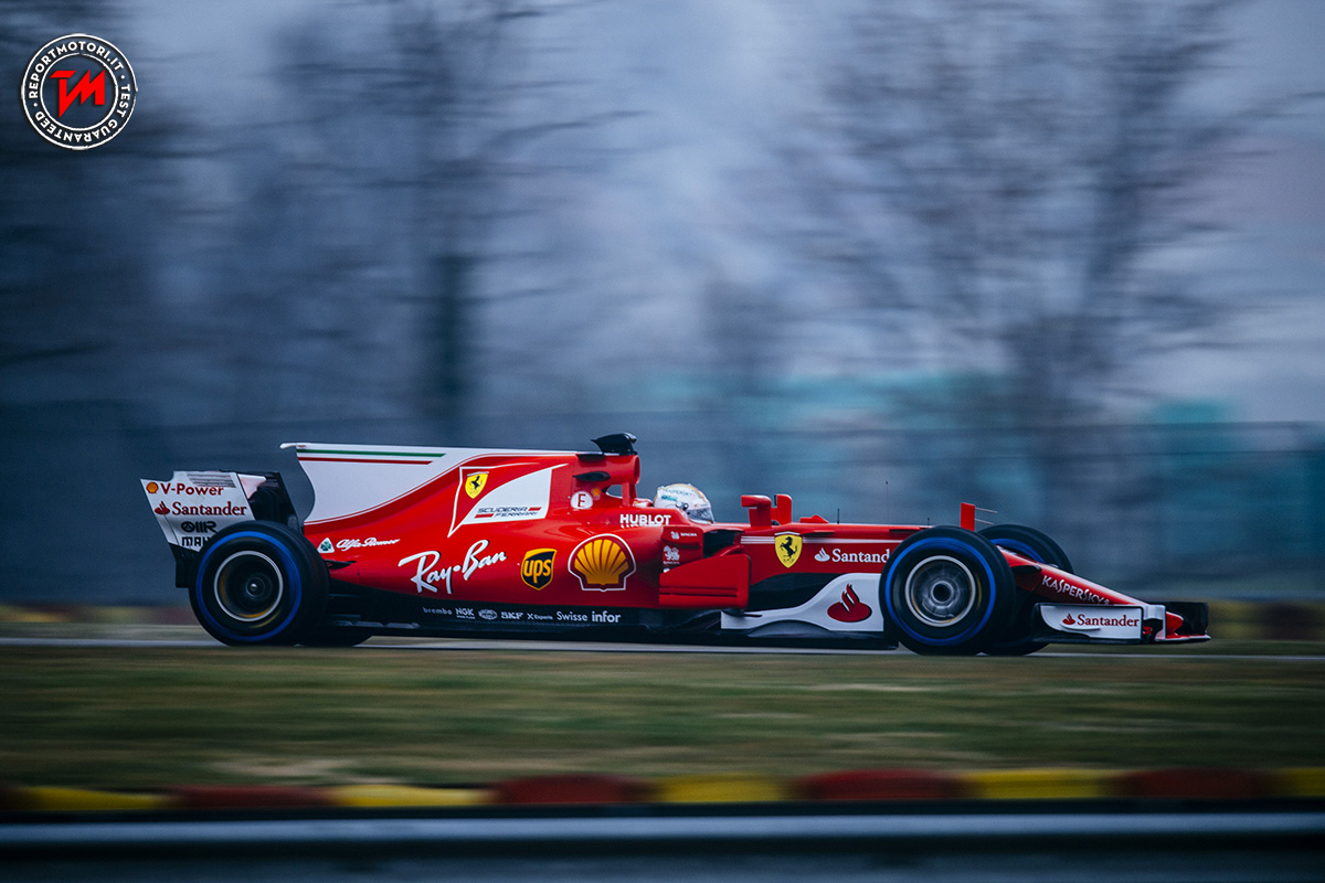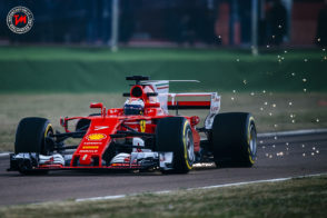 La saracinesca del box di Fiorano – allestito per l’occasione con un look tutto diverso – si è alzata alle 9,45, sotto gli occhi del Presidente e AD del Cavallino Sergio Marchionne, del team principal Maurizio Arrivabene, del direttore tecnico Mattia Binotto, dei piloti Kimi Raikkonen , Sebastian Vettel e Antonio Giovinazzi , e di tutti i dipendenti che seguivano la presentazione dalla vicina sede di Maranello. Dopo la preparazione di routine, la monoposto è uscita dal box alle 11,20 ora italiana, equipaggiata con pneumatici “Demo” destinati ai filming day, vale a dire con le stesse misure “maggiorate” delle gomme di quest’anno, ma mescole diverse. Una visione rara, quella di una monoposto dell’anno in corso sulla pista di casa della Ferrari: i regolamenti attuali non permettono più di svolgere prove nel corso della stagione, se non quelle collettive. Fanno eccezione, appunto, i 100 Km consentiti per la giornata promozionale, che Raikkonen prima e Vettel poi hanno sfruttato nel corso della giornata, dividendosi in parti uguali la distanza massima fissata dalle regole, nonostante la pioggia che ha ritardato alle 15,40 la prima uscita di Sebastian.