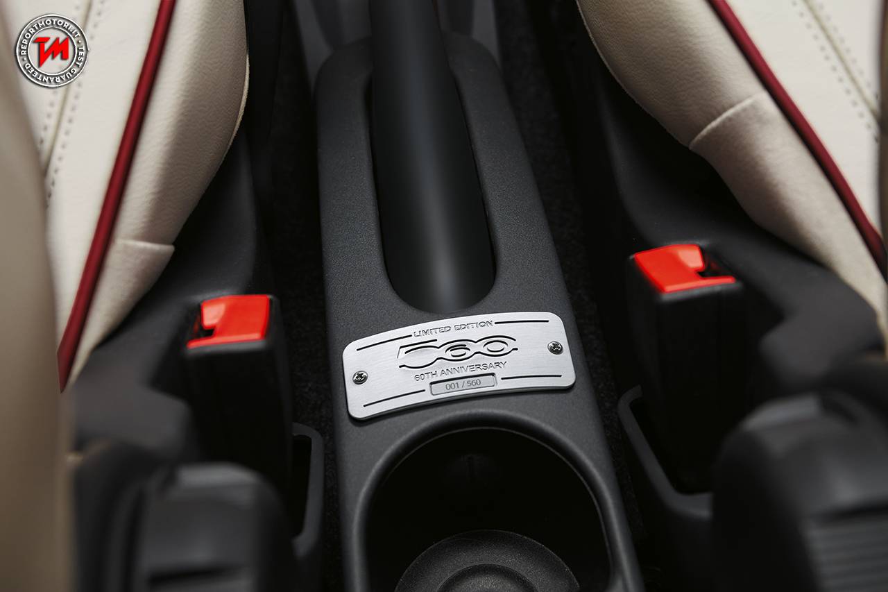 La Fiat 500 serie speciale dedicata al 60esimo anniversario sarà ordinabile dal 9 marzo e disponibile in 560 unità accompagnate da certificato di autenticità nominativo nei principali mercati della regione EMEA, con consegne a partire dal 4 luglio. Accenti rétro anche all’interno, come gli elementi tubolari della selleria in pelle avorio con cuciture bordeaux a contrasto, a riprendere la fascia centrale del cruscotto e i tappetini specifici bicolore. L’omaggio al passato si limita all’estetica: dal punto di vista tecnologico la serie speciale dedicata al sessantesimo anniversario offre quanto di meglio oggi disponibile nel campo della tecnologia e del comfort a bordo. Sono di serie pomello del cambio e volante in pelle con comandi integrati, il sistema UconnectTM 7″ Radio Live touchscreen con Bluetooth, navigatore satellitare e ingressi USB e AUX IN; il TFT 7″, il climatizzatore automatico, fendinebbia e i sensori di parcheggio posteriori. Non mancano le novità introdotte dal MY2017: Speed Limiter e Cruise control e i sistemi CarPlay e Android Auto , grazie ai quali l’utente può accedere alle principali applicazioni del proprio smartphone direttamente tramite lo schermo 7″ del Uconnect integrato nella console centrale.