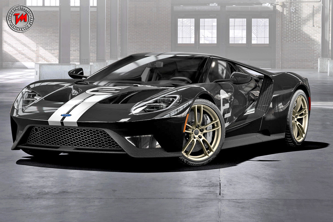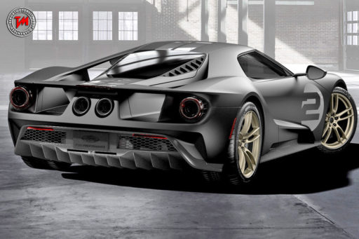 La carrozzeria in tonalità Shadow Black della Ford GT ’66 Heritage Edition , declinata in versione sia lucida che matta, è personalizzata con stripes in argento che attraversano centralmente cofano, tetto e alettone posteriore, adesivi a sfondo bianco con numero di gara #2 posizionati su cofano e portiere, dettagli in fibra di carbonio a vista e cerchi da 20’’ realizzati in blocco unico di alluminio forgiato, con finitura in oro satinato.