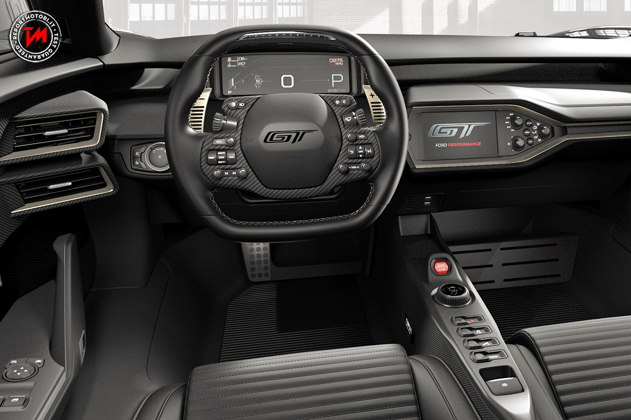 La Ford GT è dotata del nuovo display digitale adattivo da 10’’, che utilizzando grafiche e linee ispirate al mondo delle auto da corsa è in grado di aiutare il guidatore a mantenere l’attenzione sulla guida, evitando le distrazioni. Riconfigurandosi automaticamente, sulla base di 5 diverse modalità di guida – Normal, Wet, Sport, Track e V-Max – permette al guidatore di avere tutte le informazioni necessarie in un formato semplice e immediato, adattato in base alle specifiche esigenze.