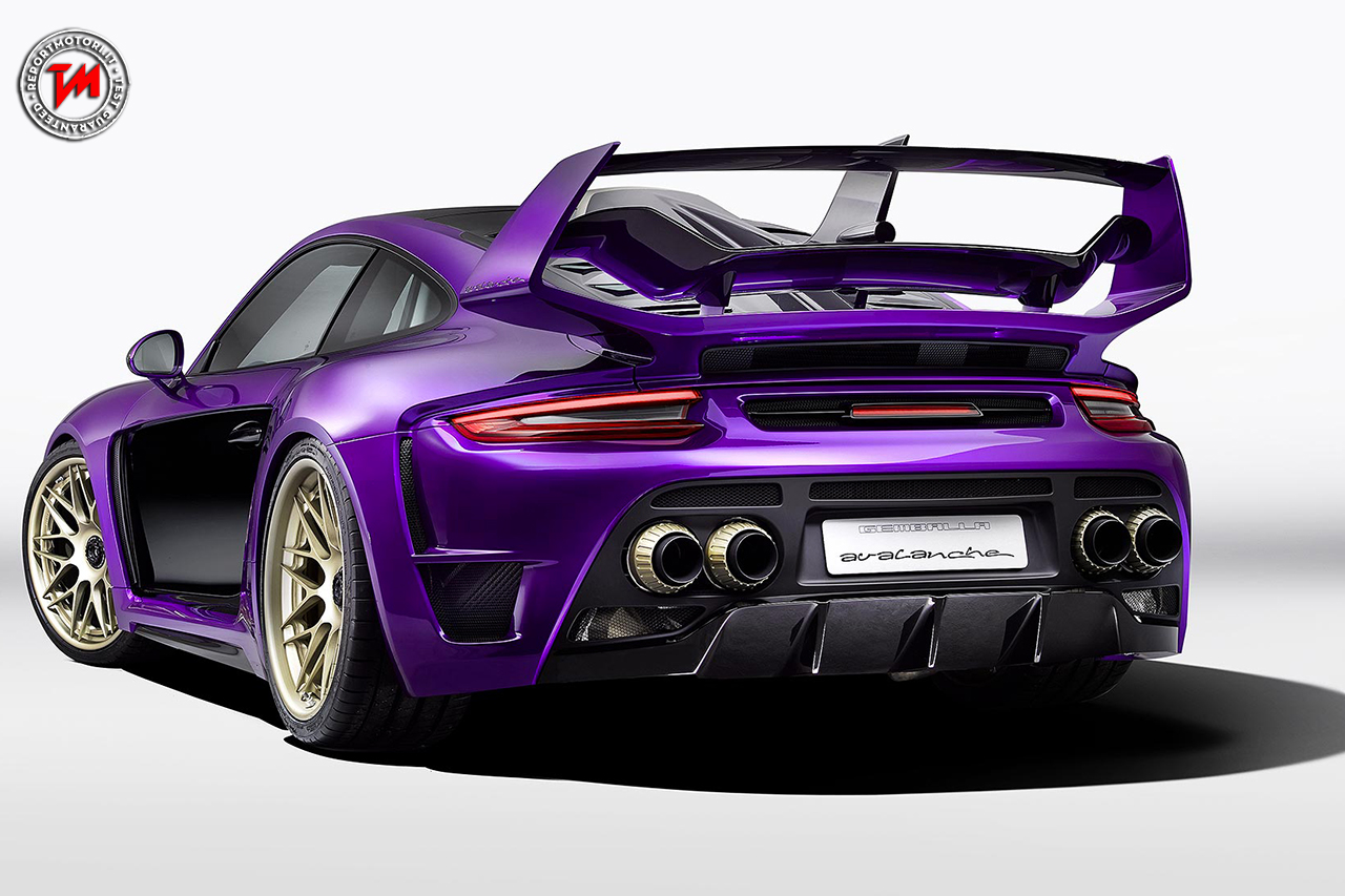 Un enorme alettone tripla ala, quattro terminali di scarico che sembrano esser presi in prestito dalla Porsche Carrera GT , l’estrattore aria è immancabile così come le voluminose prese aria laterali.