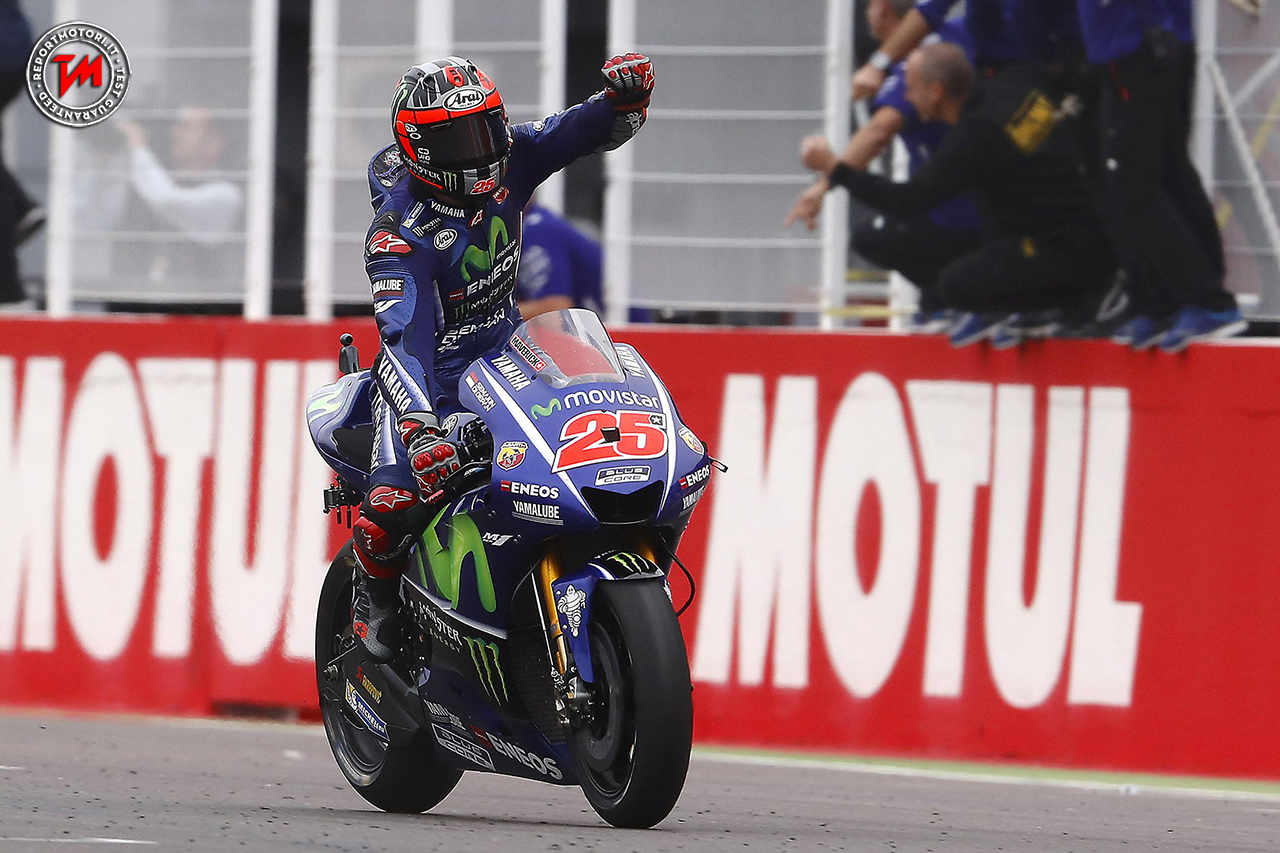 Vinales , portacolori Movistar Yamaha, fa sua la seconda gara consecutiva e allunga la striscia di dominio nella classe, le sue prestazioni con la YZR-M1 sono di altissimo livello e sulla pista di Termas de Rio Hondo dimostra velocità, freddezza e calcolo tagliando il traguardo per primo con un margine di quasi 3 secondi sul compagno di box Valentino Rossi, alla sua gara numero 350.