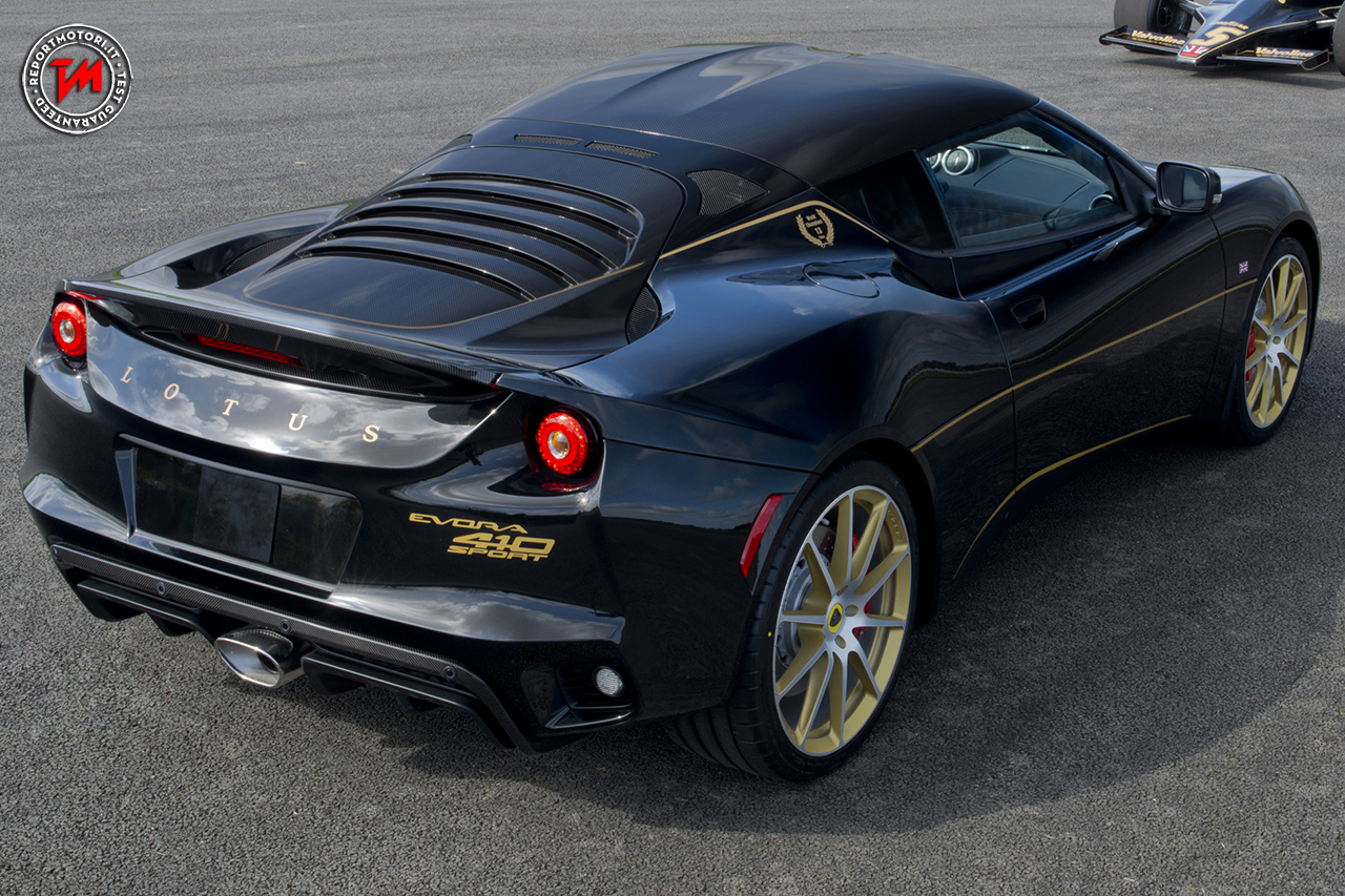 Viene prodotta in una colorazione esclusiva, la GP Edition , la nuova Lotus Evora Sport 410 ha subito un notevole alleggerimento, rispetto alla serie 400, ma è anche notevolmente più veloce visti i suoi 0-100 km/h in soli 3,9 secondi e la sua velocità massima di 190 miglia!