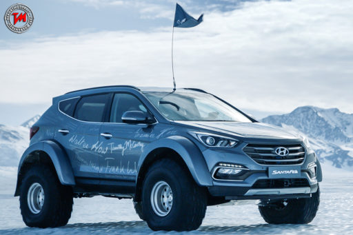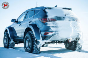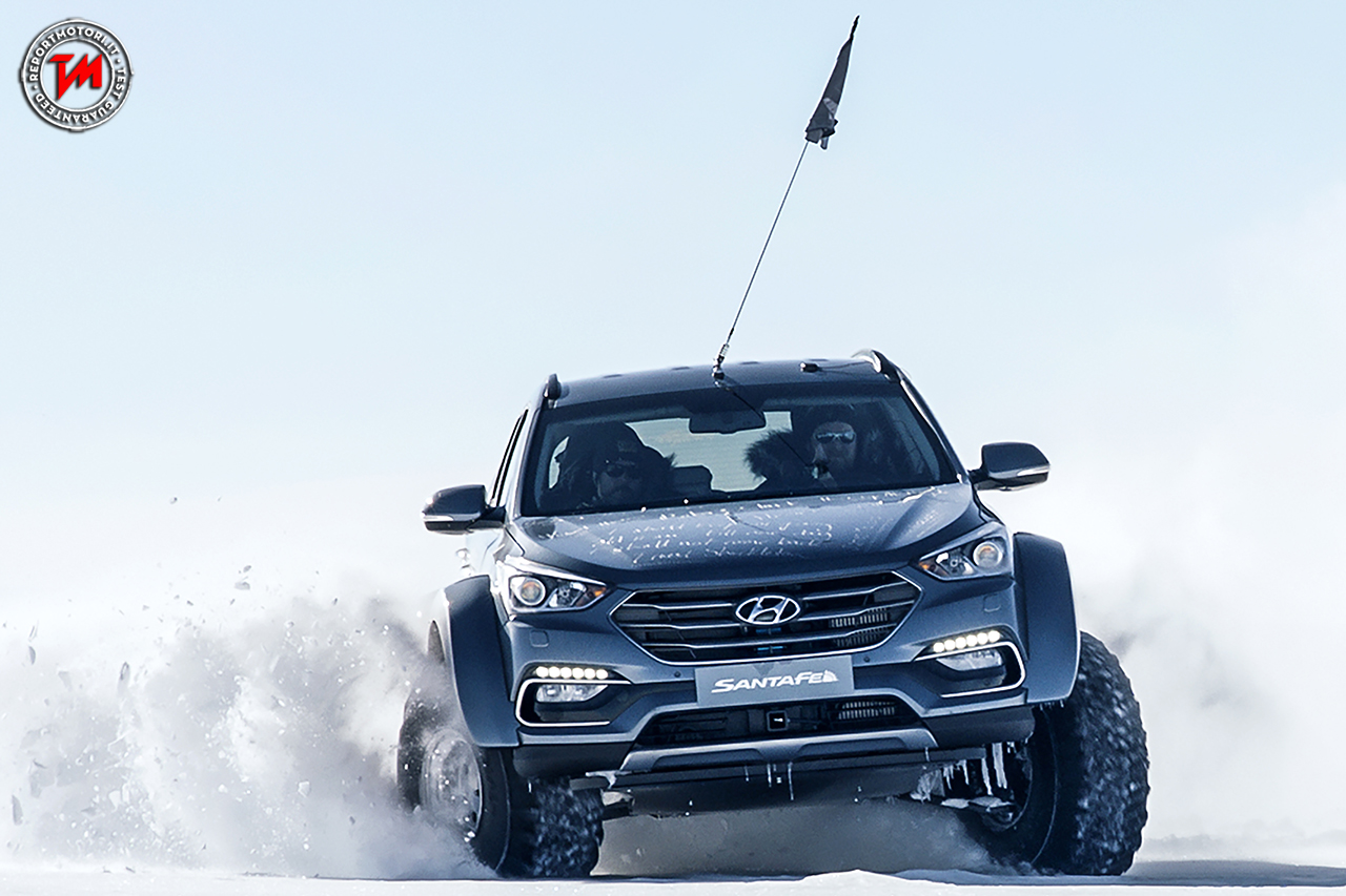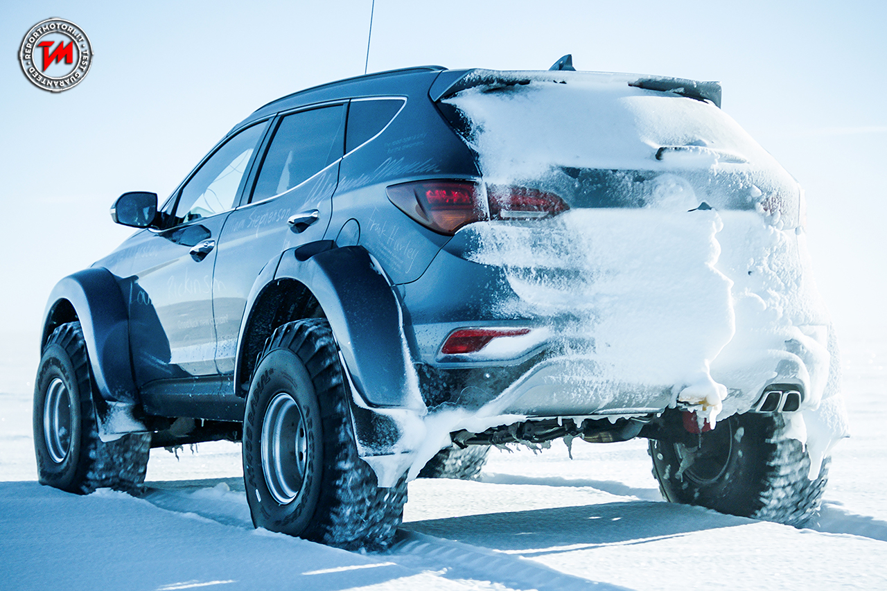 Guidare un auto sul ghiaccio non è facile, la trasformazione della Hyundai Santa Fe ha riguardato pneumatici extra maggiorati, sospensioni, mozzi ruota e passaruota.