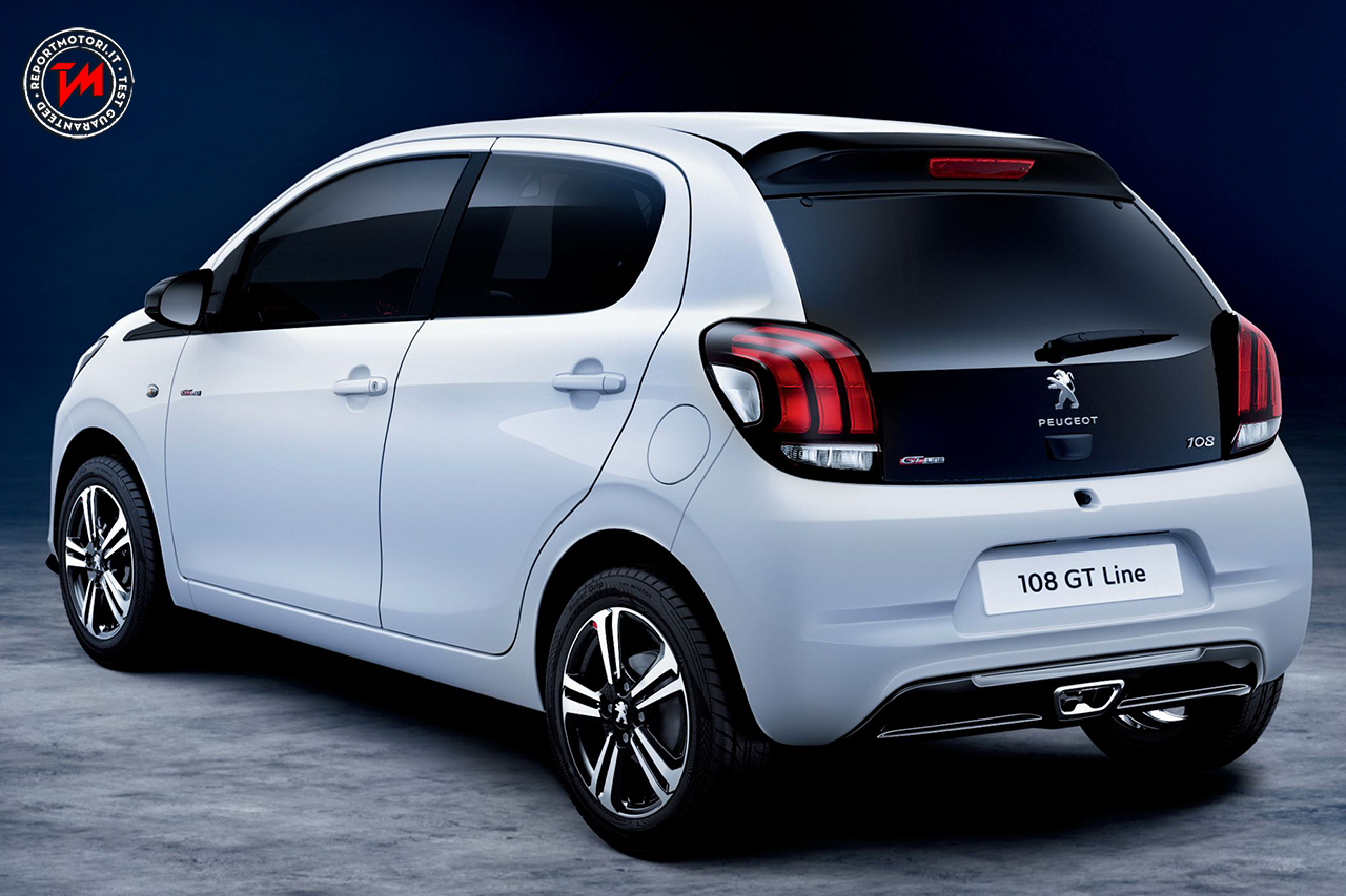 La nuova versione GT Line si differenzia dalle altre 108 nella carrozzeria (proposta nei colori Rosso Scarlet, Bianco Lipizan, Nero Caldera, Grigio Galliume Grigio Carlinite) ma anche nell’abitacolo. Esternamente 108 GT Line è immediatamente riconoscibile per la calandra con la scritta Peugeot rossa, per i cerchi in lega da 15” della Linea “S”, per lo spoiler posteriore nero Caldera con terminate di scarico centrale, per il lunotto oscurato, per gli spoiler anteriori neri con banda rossa.