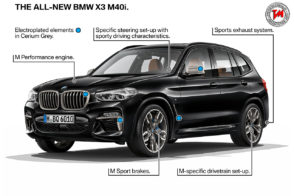 Con la potente BMW X3 M40i da 265 kW/360 CV (consumo di carburante nel ciclo combinato: 8,4 – 8,2 l/100 km; emissioni di CO2 nel ciclo combinato: 193 – 188 g/km ) la Serie comprende per la prima volta un’automobile M Performance.