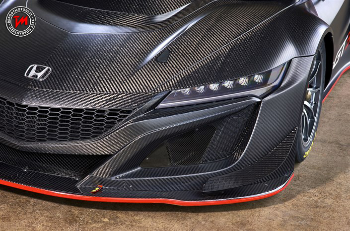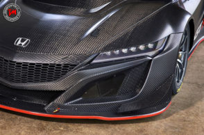 La fibra di carbonio riveste carrozzeria e parti del telaio, l’aerodinamica della Honda NSX GT3 è curatissima, del resto per raggiungere prestazioni elevatissime in pista, occorre realizzare un’auto curata nei minimi dettagli.