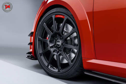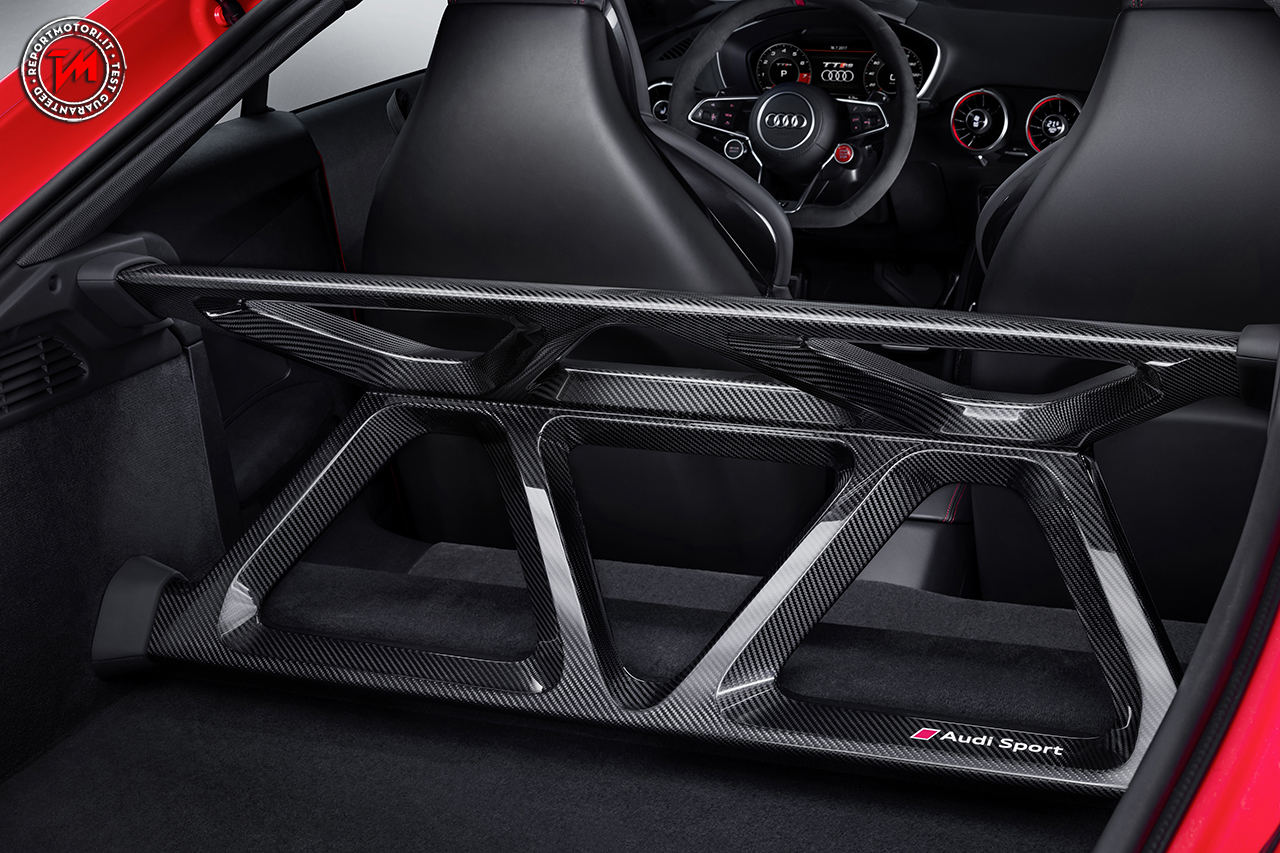 Accattivanti elementi per l’abitacolo completano infine il programma. Sia per Audi R8 sia per Audi TT è disponibile il volante sportivo sagomato multifunzionale plus; la sua corona rivestita in Alcantara è caratterizzata da una marcatura di colore rosso a ore 12. Per i modelli dotati di cambio S tronic a sette marce sono disponibili a richiesta i paddle in fibra di carbonio. Audi Sport ha inoltre sviluppato appositamente per il modello TT un telaio a croce, anch’esso in fibra di carbonio CFRP, che sostituisce il divano posteriore, diminuendo il peso complessivo di circa 20 kg e migliorando la rigidità torsionale. Ciò apporta notevoli vantaggi in termini di manovrabilità, specialmente nelle curve percorse ad alta velocità.