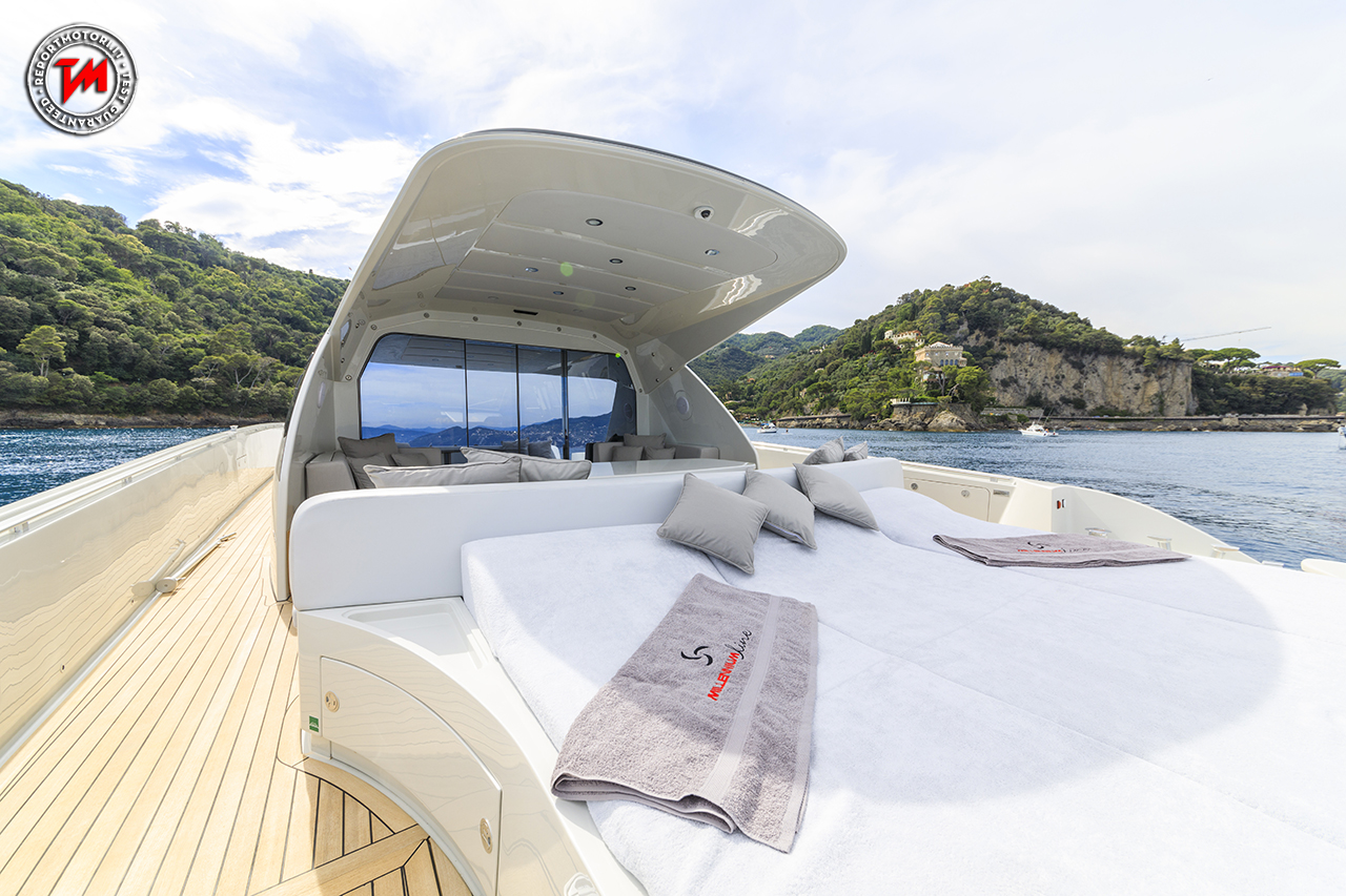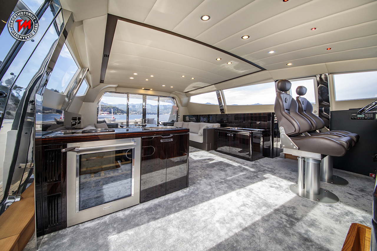 Lo scafo a V profonda si traduce, per chi naviga, in un comportamento morbido e fluido sulle onde assicurando anche con mare formato una velocità di crociera di 41 nodi a 2.150 giri in tutta sicurezza.