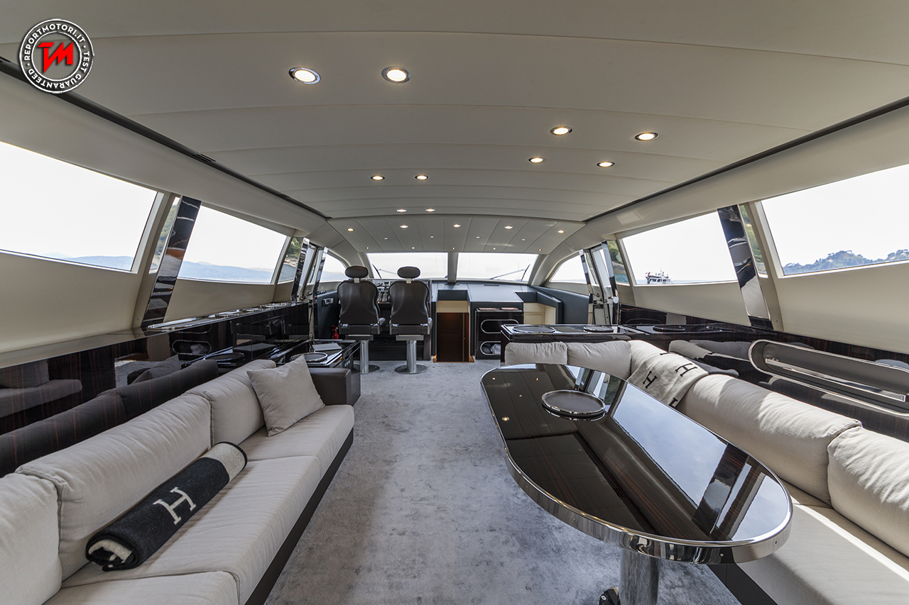 Il design degli arredi, combinato all’uso di ebano laccato con inserti in acciaio cromato, teak naturale e moquette in seta e cachemire, spicca per i suoi contrasti cromatici, che creano un’atmosfera affascinante e accogliente, capace di enfatizzare ulteriormente la spaziosità degli ambienti.