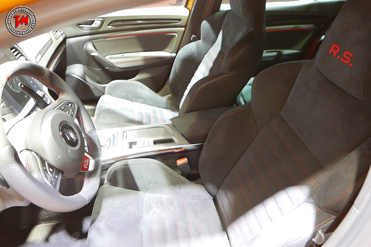Per la prima volta su un veicolo di serie, Megane R.S. adotta la nuova firma Renault Sport, comune a Renault Sport Racing e Renault Sport Cars. Un nuovo colore, l’Orange Tonic, rende più dinamico il design esterno, mentre grande attenzione è stata dedicata agli interni: sedili anteriori sport con poggiatesta integrato, impunture rosse, ambiente grigio scuro, sellerie in tessuto o Alcantara®, badge R.S….
