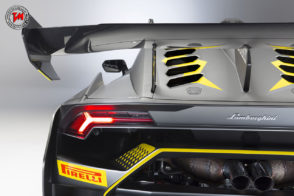 La nuova Lamborghini Huracán Super Trofeo EVO presenta novità anche nella parte posteriore, sempre con il fine di aumentare l’efficienza aerodinamica e la stabilità. I parafanghi posteriori hanno una superficie piatta e allungata verso la coda: la funzione aerodinamica è quella di garantire che lo stacco del flusso d’aria dalla coda sia sempre fisso e costante indipendentemente dal fatto che si stia percorrendo una curva o un rettilineo, sempre a vantaggio della stabilità.
