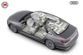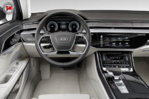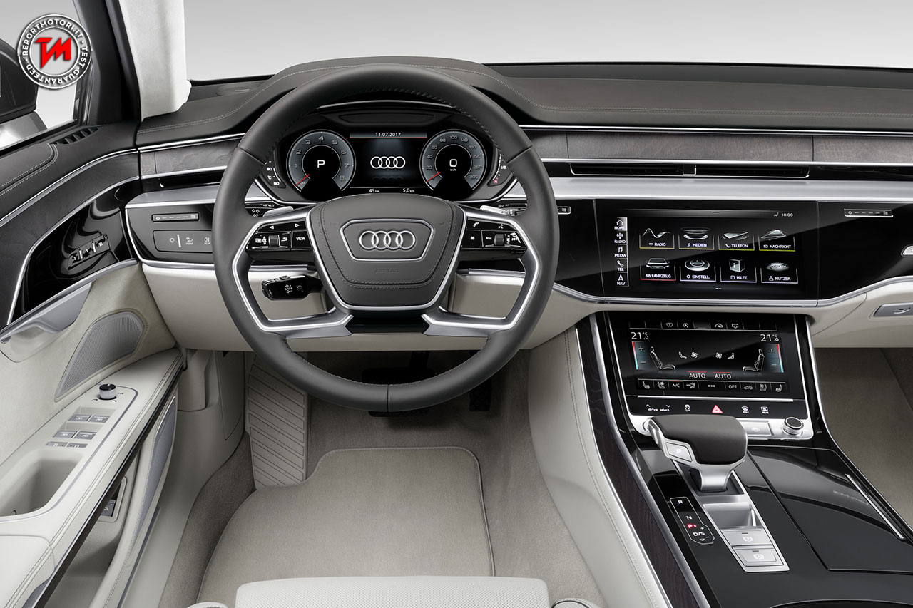 L’abitacolo della nuova Audi A8 ricorda una grande e spaziosa lounge. Rispetto al modello precedente, la vettura è cresciuta in lunghezza di 32 millimetri in entrambe le varianti di carrozzeria. Gli interni sono ridotti all’essenziale, con un’architettura configurata in senso orizzontale. Al buio l’illuminazione dei profili e una luce diffusa nell’abitacolo mettono elegantemente in risalto le incisive linee degli interni. Per il vano posteriore sono disponibili nuove luci di lettura a LED Matrix, regolabili con estrema precisione. L’offerta di equipaggiamenti e materiali è estremamente varia e denota un’altissima qualità di lavorazione artigianale in ogni dettaglio: dai rivestimenti dei sedili traforati agli inserti decorativi che si aprono e si chiudono elettricamente sopra le bocchette dell’aria, fino alla morbida pelle degli appoggiatesta comfort.