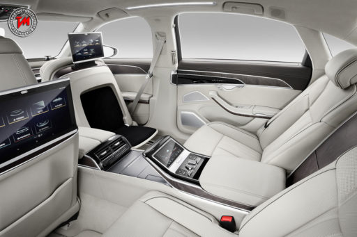 Il posto più ambito a bordo della nuova ammiraglia Audi si trova nella parte posteriore a destra: si tratta del sedile relax (a richiesta) di A8 L, che offre molteplici possibilità di regolazione ed è dotato di poggiapiedi integrato nello schienale del sedile del passeggero anteriore. Qui il passeggero può farsi riscaldare e massaggiare le piante dei piedi scegliendo tra vari programmi. Il pacchetto sedile relax comprende anche funzione massaggio alla schiena, appoggiatesta comfort regolabili elettricamente in altezza, appoggiapiedi, una lunga consolle centrale (a richiesta dotata di tavolini ribaltabili con regolazione in inclinazione su due livelli), climatizzatore automatico comfort a quattro zone, Rear Seat Entertainment composto da due Audi tablet e Rear Seat Remote. Grazie alla nuova unità di comando touch, i passeggeri posteriori possono gestire numerose funzioni relative a comfort e infotainment nonché fare telefonate private. Il Rear Seat Remote con il suo display OLED estraibile vanta le stesse dimensioni di uno smartphone ed è posizionato nell’appoggiabraccia centrale.