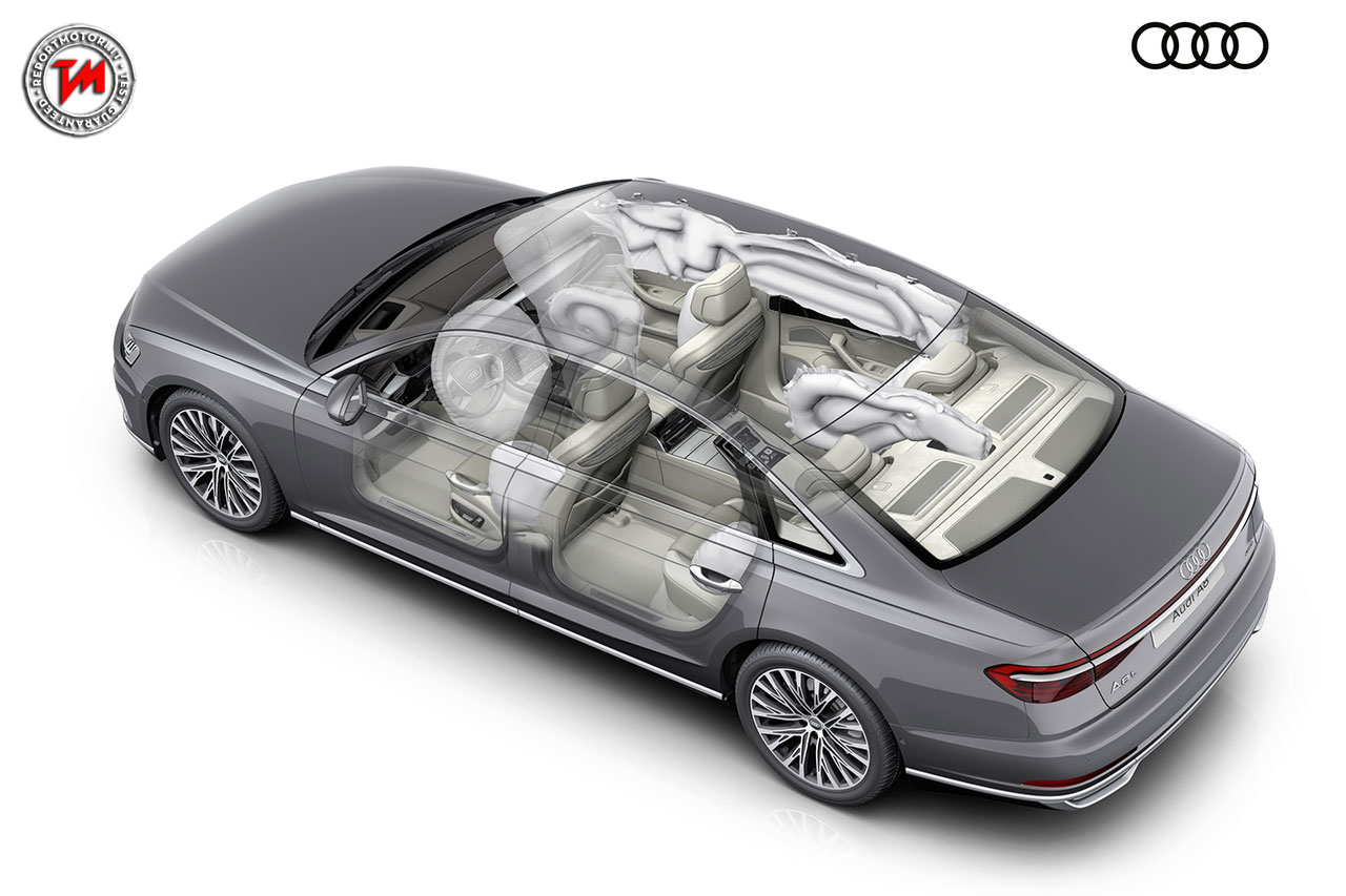 La carrozzeria della nuova A8, progettata secondo il principio dell’Audi Space Frame, è composta al 58% da parti in alluminio, sensibilmente più rigide rispetto a quelle utilizzate sul modello precedente. La cellula abitacolo, costituita da componenti in acciaio lavorato a caldo, è completata da una parete posteriore ultrasolida e resistente alla torsione realizzata in materiale plastico rinforzato con fibre di carbonio. Una barra per il duomo ammortizzatore in magnesio completa il concetto di costruzione leggera. Grazie al mix di questi quattro diversi materiali, la berlina Audi raggiunge un livello inedito nel campo della struttura multimateriale, e non solo per la riduzione di peso. Infatti dall’eccezionale rigidità della