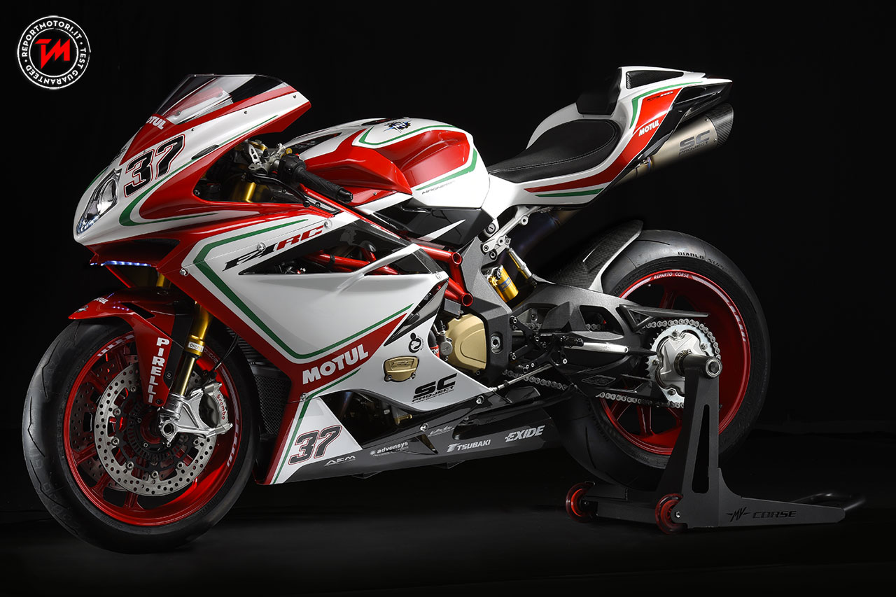 Elegante ed essenziale, la nuova MV Agusta F4 RC è riconoscibile per la grafica su base bianca e rossa, la stessa della versione ufficiale, compresi i loghi degli sponsor. Il “37” sulle tabelle porta numero ricorda i titoli mondiali costruttori conquistati da MV Agusta.