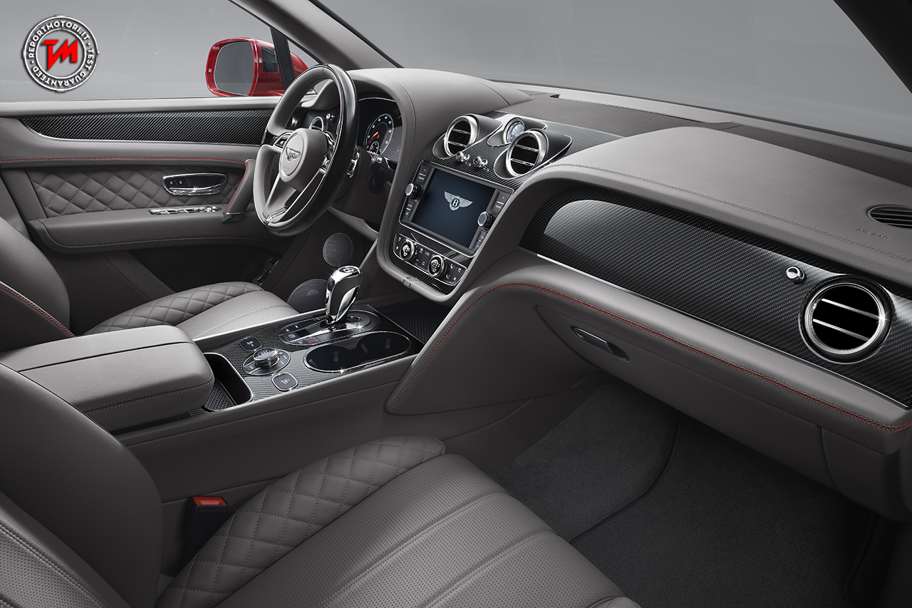 Nel Bentayga V8 vengono offerte tre nuove innovative opzioni per gli interni: una finitura lucida in fibra di carbonio che sostituisce e superfici in radica tradizionali; un volante in radica pelle; e una nuova e ricca pelle in colore rosso, Cricket Ball.