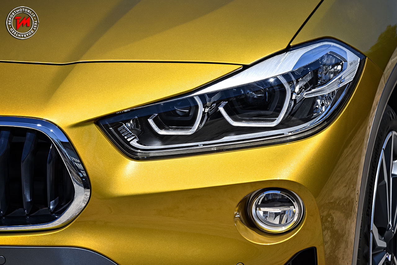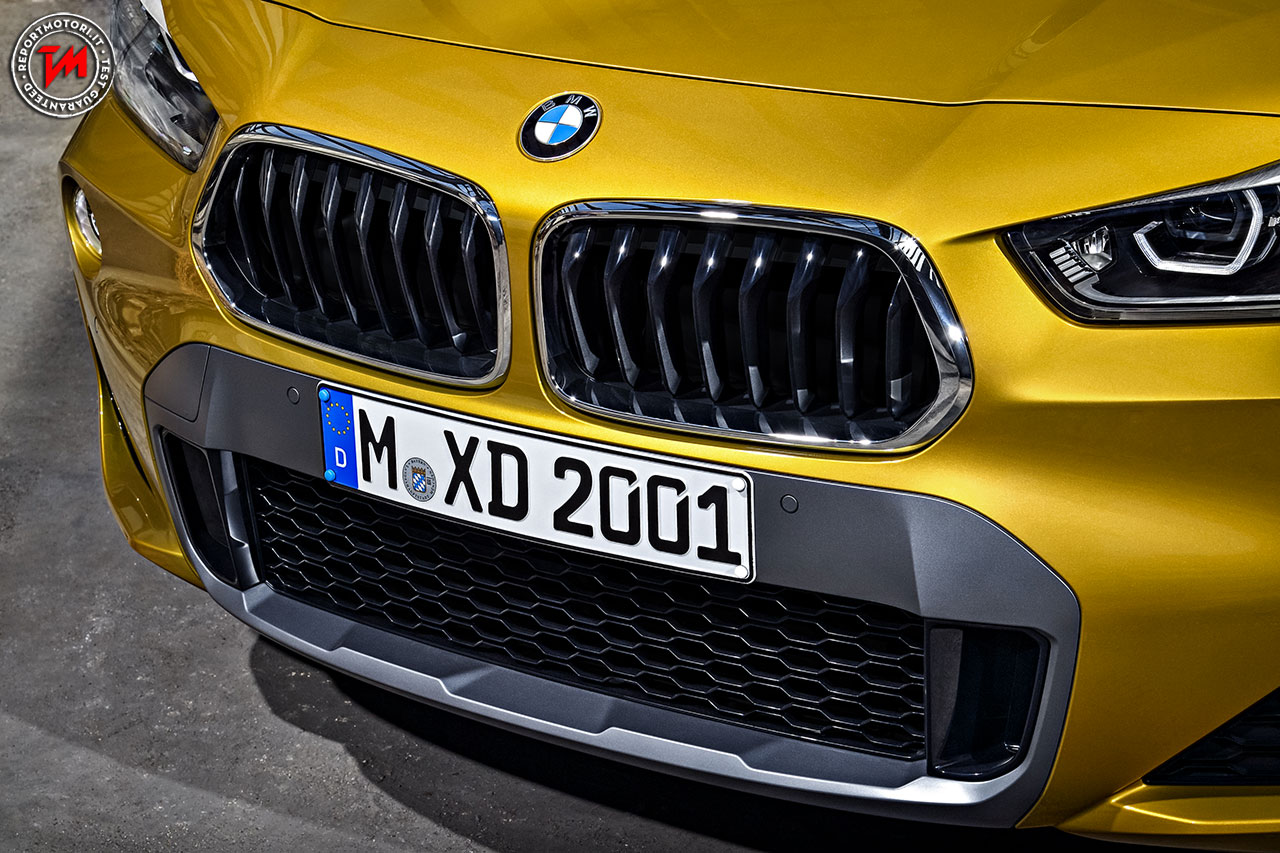 Due gli elementi che caratterizzano la nuova BMW X2 , la nuova mascherina anteriore, il tradizionale doppio rene assume dimensioni e connotazione differente, così come il badge che sul terzo montante identificano il neonato SUV.