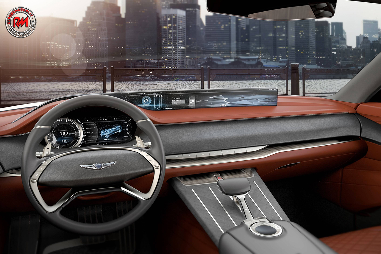 Gli interni del Concept GV80 presentano un’interfaccia Human Machine innovativa che offre agli utenti un funzionamento intuitivo e il controllo delle funzioni attraverso l’uso di un nuovo controller interattivo multi-funzione touch. Tutta questa tecnologia si integra perfettamente nell’essenza del veicolo.
