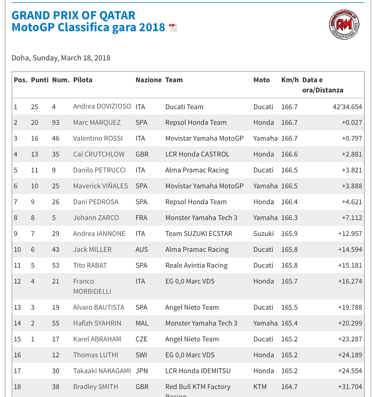 Dopo aver ricordato il mitico Ivano Beggio, tutto è pronto o quasi, perché sulla griglia di partenza c’è un grande Johann Zarco , autore di una splendida pole e recordman del circuito, alle sue spalle un ritrovato Petrucci: a fine gara arriveranno rispettivamente ottavo e quinto!