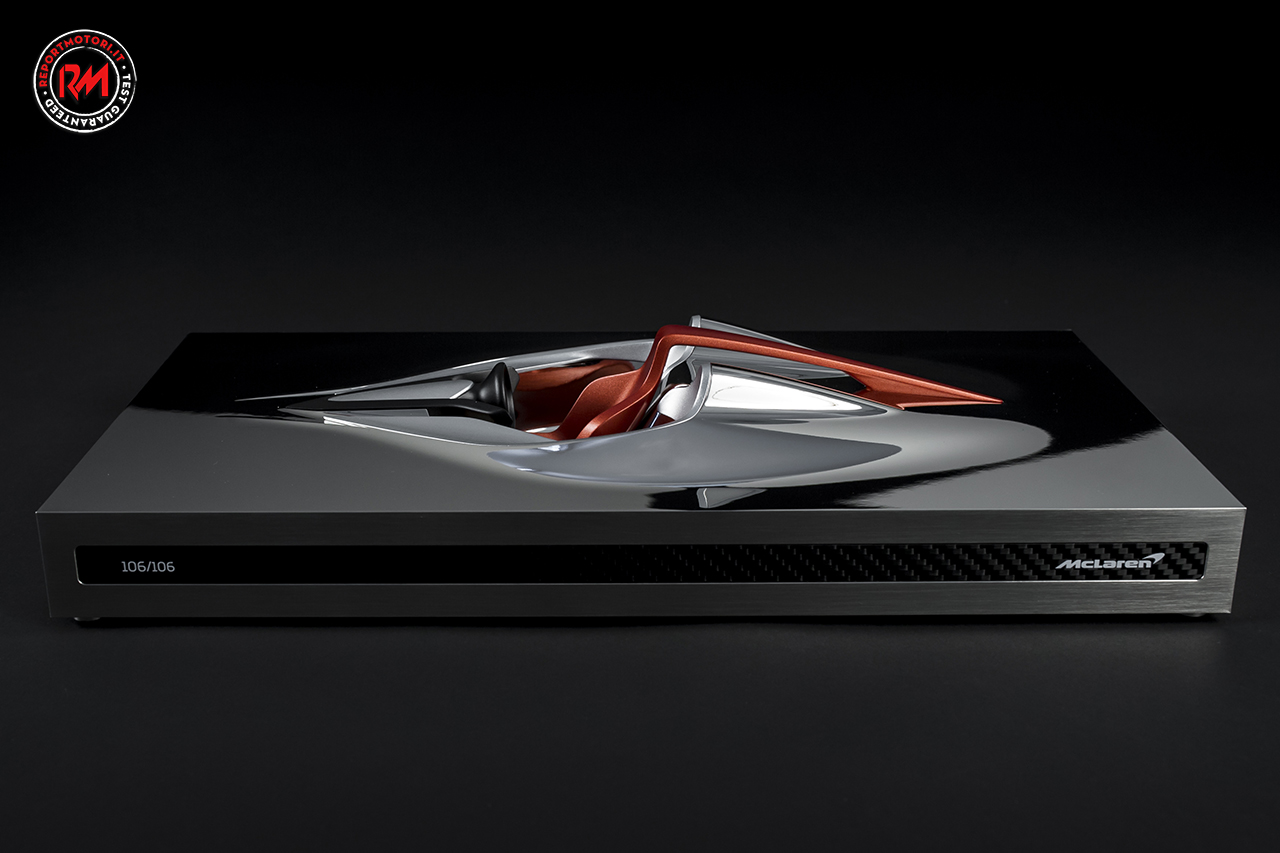 Questo pezzo d’arte tridimensionale, che misura 400mm x 205mm x 80mm e pesa ben3.6kg, è uno stimabile pezzo di “fine artigianato” creato nel puro spirito avanguardistico del design automobilistico di McLaren Automotive . Ogni pezzo è lavorato con l’ultimissima tecnologia di taglio CNC a 5-assi ma assemblata e rifinita a mano, e si basa sull’interazione delle mani, occhi e abilità artigianali per ottenere un oggetto unico.