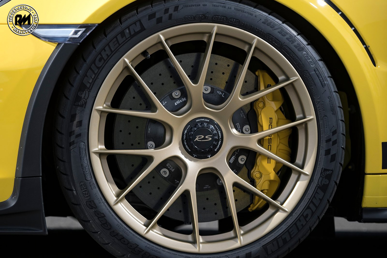 Porsche fornisce la 911 GT3 RS di serie con ruote in alluminio forgiato che sono assicurate con un meccanismo di bloccaggio centrale con scritta “RS”. Come opzione, in combinazione con il pacchetto Weissach, la 911 GT3 RS può essere equipaggiata con ruote forgiate in magnesio della stessa dimensione; queste ruote riducono il peso del veicolo – e quindi anche le masse rotanti che sono particolarmente rilevanti in termini di dinamica di guida – di ulteriori 11,5 chilogrammi.
