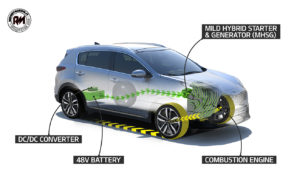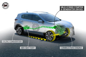 L’innovativo sistema è composto da una batteria a 48 Volt, uno starter/generator e un convertitore DC/DC. Per l’accumulo di energia impiega una batteria compatta agli ioni di litio da 0,46 kWh. Lo speciale starter/generator Mild-Hybrid Starter-Generator (MHSG) in grado di fornire coppia in