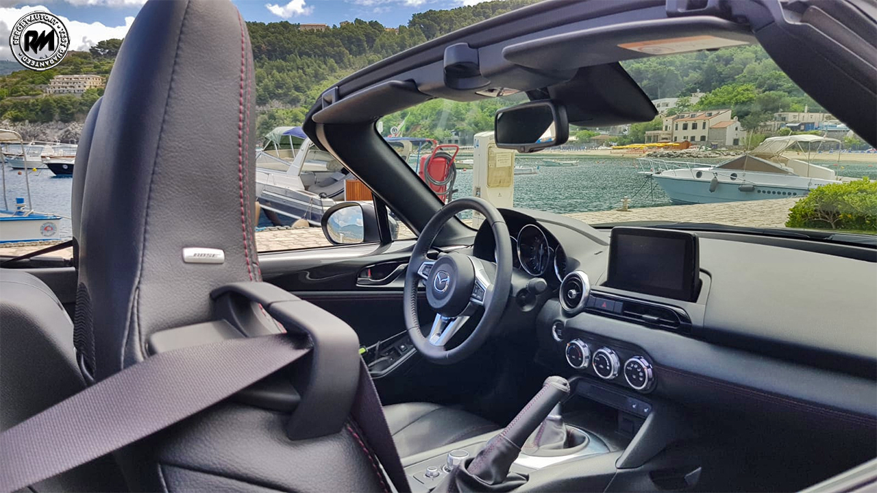 L’abitacolo è accogliente, il posto guida riflette appieno la filosofia “ Jinba Ittai ”, l’umanocentrico, dove il pilota è tutt’uno con la vettura, esattamente come un guerriero con la sua spada affilata. Sedile comodo, avvolgente, posizione di guida perfettamente allineata, volante di ridotte dimensioni, cambio dalla leva corta e dalle escursioni brevi.
