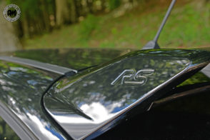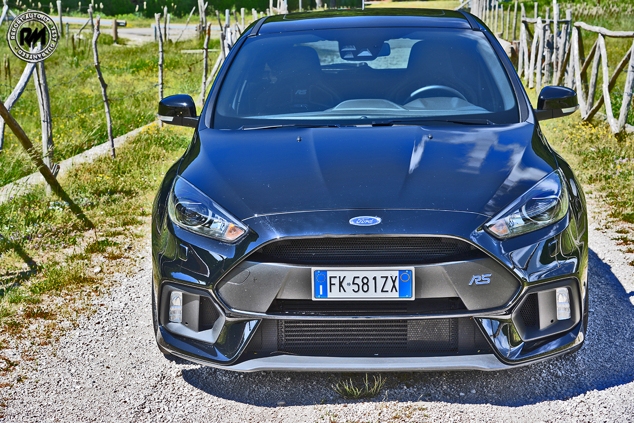 Cattiva nel frontale come nella vista di tre quarti per non parlare del posteriore, non c’è angolazione dove la Focus RS non esprima potenza e dinamismo, un concentrato di grinta esaltato da tanti particolari di chiaro stampo racing. L’anteriore è privo della classifica calandra Ford , qui non c’è spazio per vezzi estetici, tutto deve funzionare al meglio; la grossa bocca serve a portare aria fredda al radiatore, così come le ampie feritoie che caratterizzano il volto della maxi Focus.