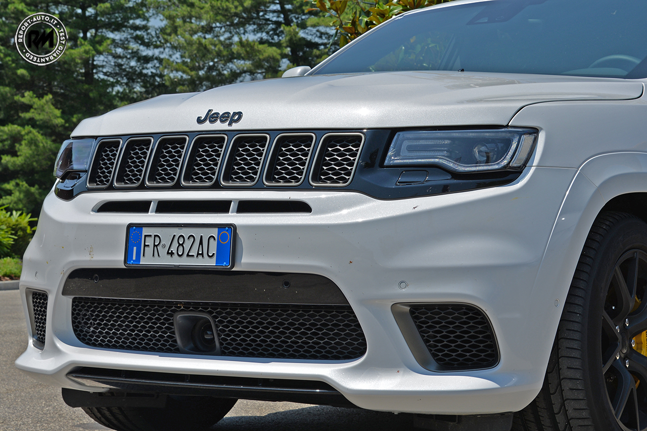 Il muso è dominato dai sottili fari bi-xeno adattivi con griglia frontale a sette ferritoie, mentre nella vista laterale immancabili sono i cechi da 20 pollici che lasciano in bella mostra grosse pinze freno Brembo con tanto di badge “Supercharged” sulle portiere anteriori e “Trackhawk” su quelle posteriori.