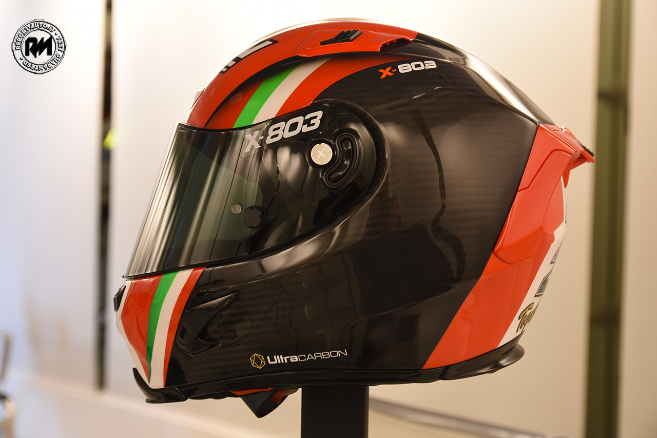 L’ X-803 Ultra Carbon rappresenta un casco commemorativo che attraverso una grafica sobria ed elegante, unisce perfettamente i due attori della partnership, il tricolore simbolo del Made in Italy ed il numero 27, da sempre rappresentativo di Casey Stoner .