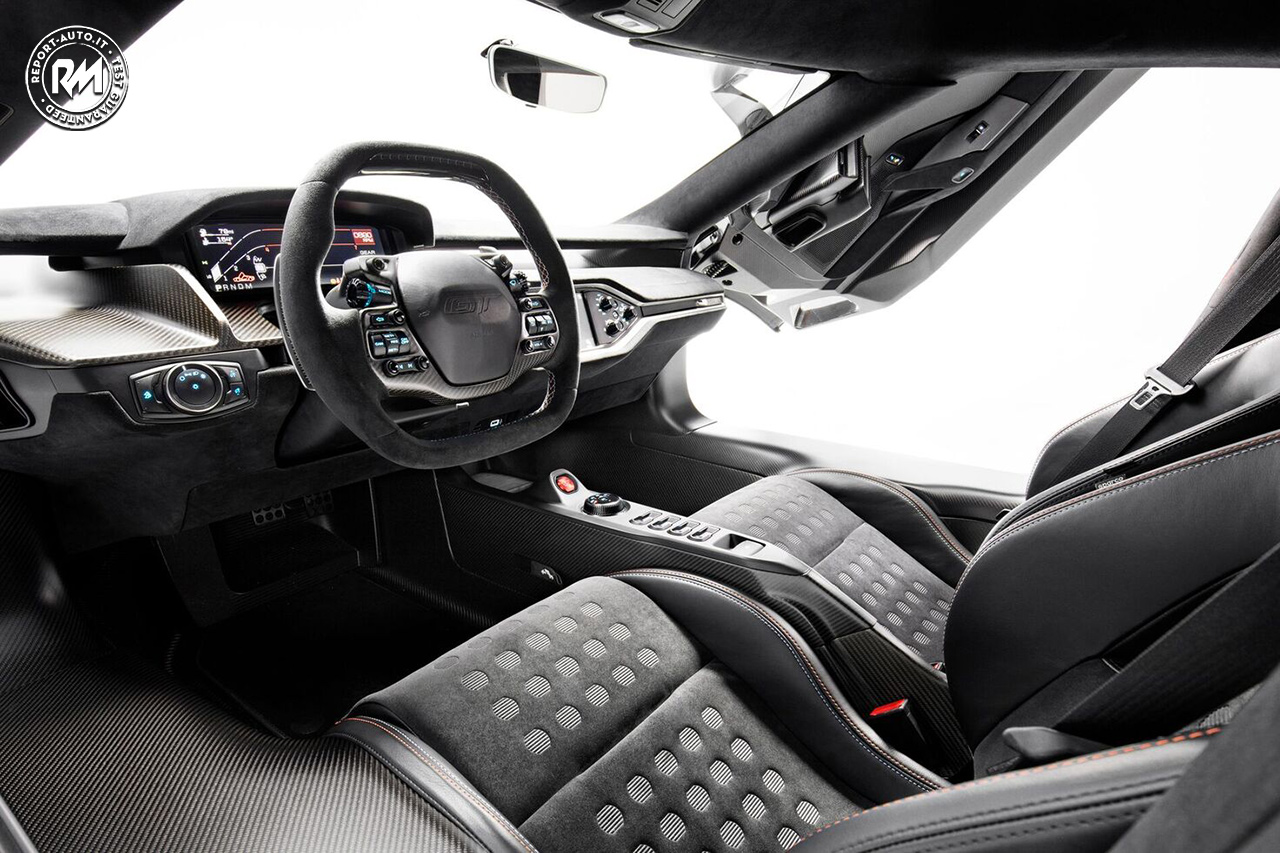 Proprio come i precedenti modelli, la Ford GT Heritage Edition presenta un esclusivo badgeidentificativo di serie, oltre alle rifiniture in fibra di carbonio opaco che impreziosiscono prese d’aria e console centrale.