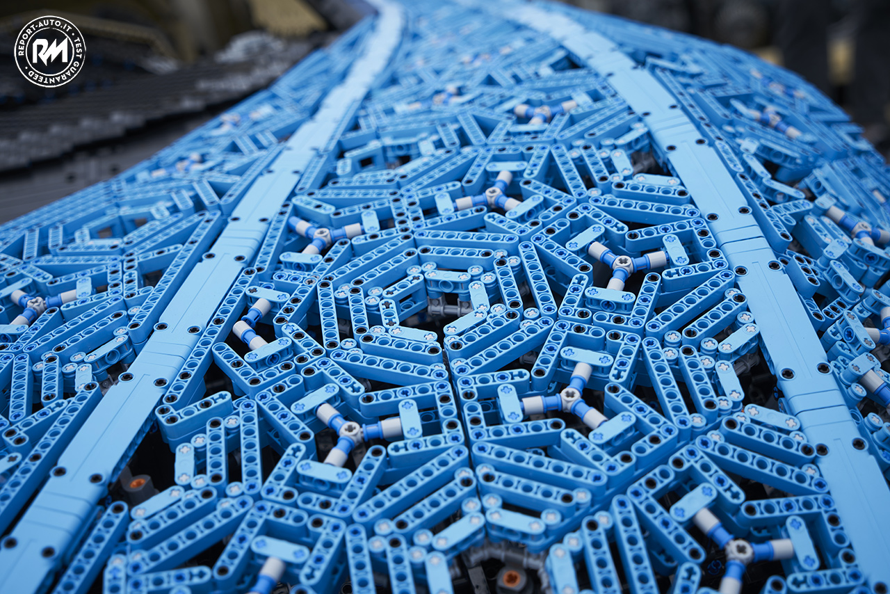 Visto da una parte l’una dall’altra, la somiglianza delle due macchine è sorprendente. La complessa carrozzeria è costruita con segmenti triangolari interconnessi realizzati in un “tessuto” LEGO Technic progettato per imitare le forme iconiche dell’originale Chiron. Ogni singolo dettaglio della vettura originale è stato ricreato con cura e precisione negli elementi LEGO Technic , dai sedili, al cruscotto, al volante.