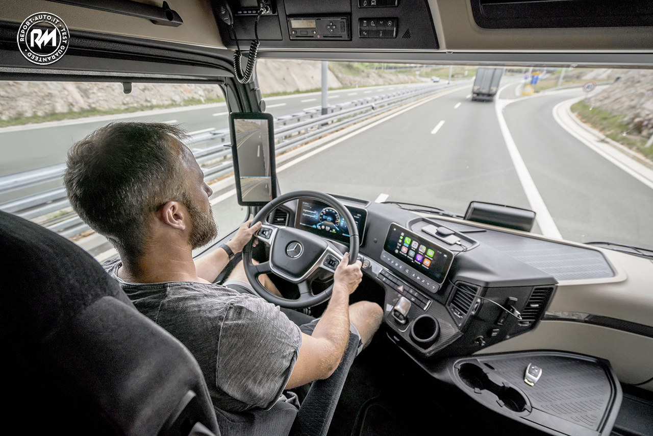 Qui vengono visualizzati i sistemi di assistenza e tutte le informazioni di base pertinenti per il conducente. La connettività è ora realtà in Actros : gli smartphone possono essere collegati tramite Apple CarPlay o Android Auto. Le app aiutano l’autista a svolgere le proprie attività di trasporto. Truck Data Center connette il truck in modo permanente al cloud e costituisce la base di tutte le soluzioni di connettività. Il monitoraggio in tempo reale del camion tramite Fleetboard e Mercedes-Benz Uptime porta valore aggiunto per il proprietario dell’azienda. Il driver gode inoltre di una maggiore facilità di utilizzo grazie alla nuova chiave di controllo remoto fornita di serie.