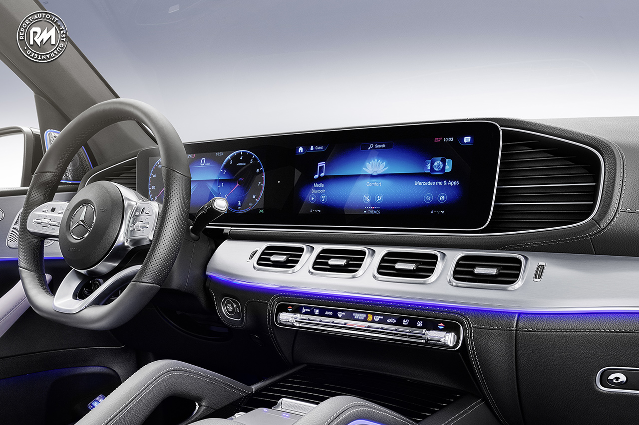 GLE è dotato dell’ultimissima generazione del sistema multimediale MBUX (Mercedes-Benz User Experience). Rispetto a Classe A, su cui ha debuttato questo rivoluzionario sistema, a bordo di GLE sono presenti di serie due ampi display da 12,3 pollici/31,2 cm, disposti l’uno accanto all’altro a formare uno spettacolare display widescreen. Gli indicatori della strumentazione e del display multimediale sono facilmente leggibili sui grandi schermi ad alta risoluzione. Animazioni coinvolgenti con grafiche brillanti in ala definizione accentuano la comprensibilità della struttura intuitiva dei comandi.